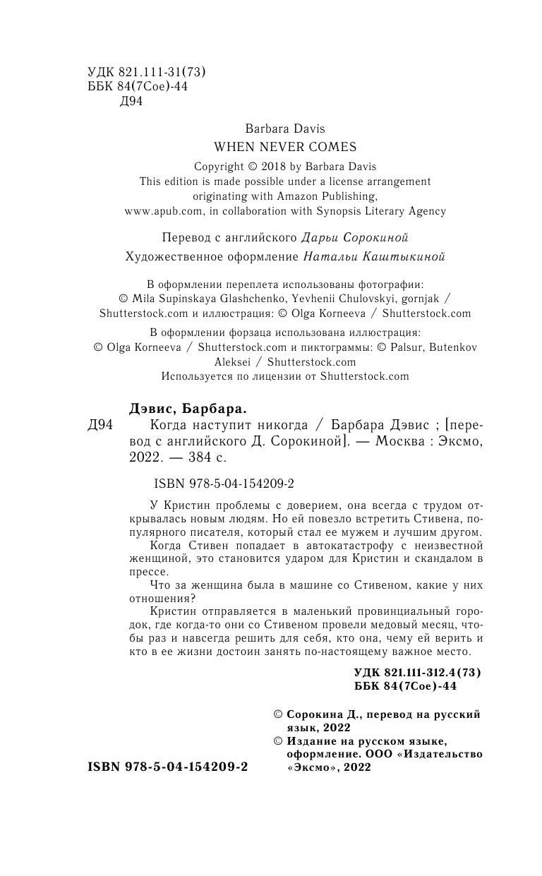 Сервис сравнения цен СкидкаГИД предлагает сравнить цены на товар «Книга: Когда наступит никогда (Барбара Дэвис); Эксмо, Inspiria, Редакция 1, 2022»