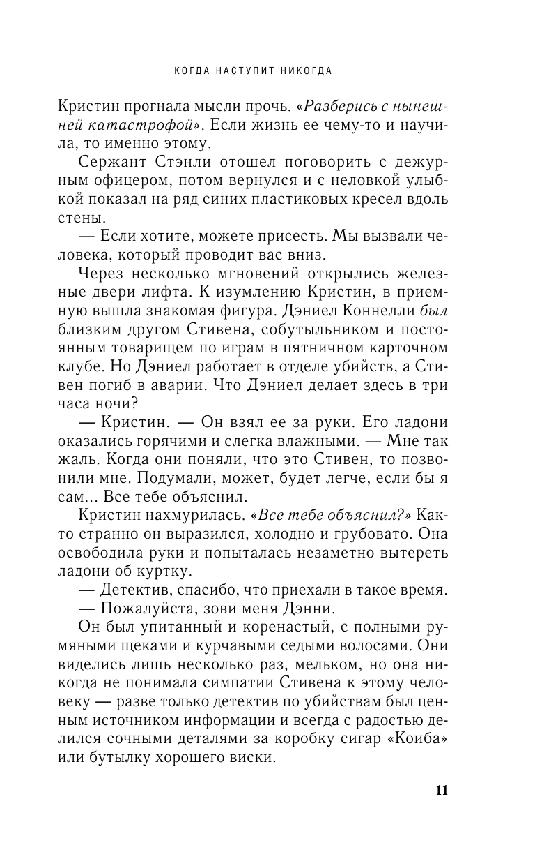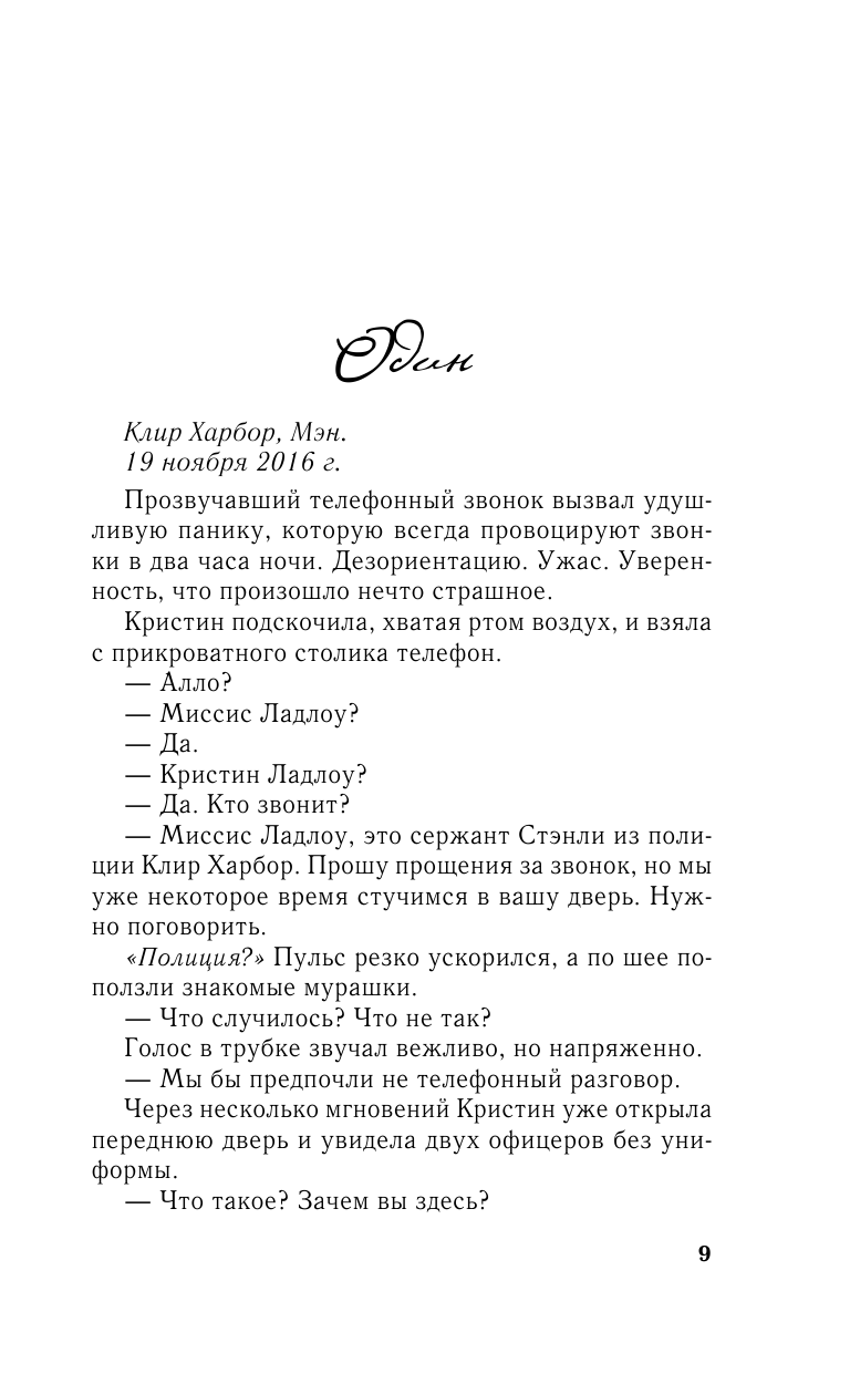 Книга начинается с опознания тела в морге. Это быстро погружает в жесткую историю. Кажется, что это детектив, но искать будут не убийцу, а другие обстоятельства гибели мужа Кристи-Линн. Она выросла в семье наркоманки и сбежала от себя в замужество с популярным писателем. Не прошло и десятка лет, как он оставил ее навсегда, утонув в машине с какой-то неизвестной блондинкой. Мне понравилось, что главы названы по дням «первый, второй». Этот отсчет со времени трагедии создает дополнительное психологическое напряжение. Очень хорошо видно, как события давят на Кристи-Линн, как она себя ощущает в первые дни, какой становится, когда их переваливает за два десятка. Женщине трудно осознать себя вдовой, хотя мужа она не сильно любила. Ей трудно смириться с тем, что журналисты пытаются выяснить, что за женщина погибла в машине с ее мужем. Неприятно, когда грязное белье твоей семьи полощут наутро во всех газетах. Кристи-Линн узнает много нового о погибшем муже и о себе. А еще найдет тех, на кого действительно можно опереться. Людей, для которых важна она сама. И о Стивене Ладлоу, который любил обманывать близких, можно будет не вспоминать никогда. Сильная книга.