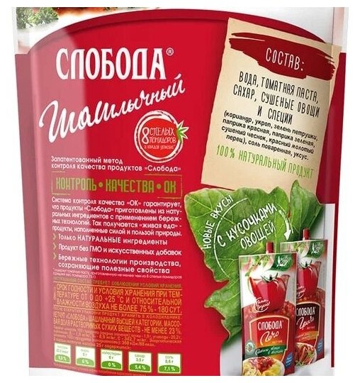 | Состав | Вода, томатная паста, сахар, сушеные овощи и специи (кориандр, укроп, зелень петрушки, паприка красная, паприка зеленая, сушеный чеснок, красный молотый перец), соль поваренная, уксус. |