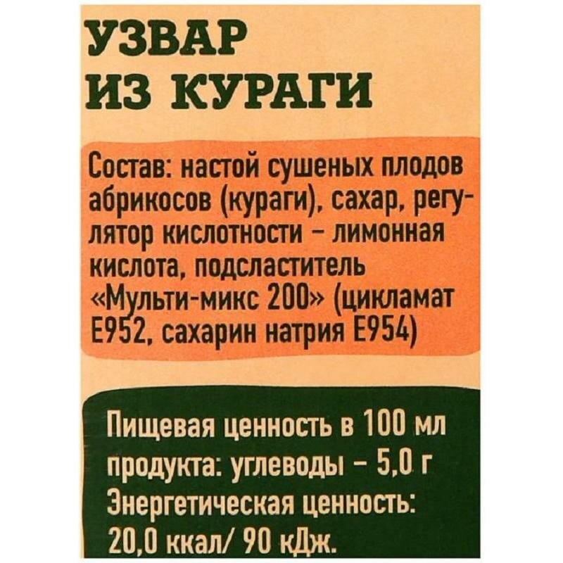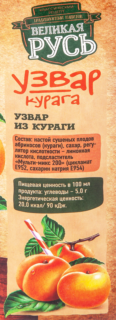 Напиток Узвар Великая Русь из кураги, 1лУзвар из кураги торговой марки 'Великая Русь' можно употреблять охлажденным для утоления жажды летом, а также теплым для согревания в холодное время года. Его изготавливают из сушеных плодов абрикосов, которые только доводят до кипения и настаивают. Такой способ производства способствует сохранению максимального количества веществ, включая каротин, магний и калий. Высокие вкусовые качества продукта обеспечивает отсутствие в составе искусственных красителей и ароматизаторов. Состав: настой сушеных плодов абрикосов (кураги), сахар, регулятор кислотности - лимонная кислота, подсластитель 'Мульти-микс 200'. Объем: 1 л. Пищевая ценность: жиры - 0 г; белки - 0 г; углеводы - 5 г. Энергетическая ценность: 20 ккал/90 кДж. Тип упаковки: картонная. Хранить не более 365 дней при температуре от +0 до +25°C.