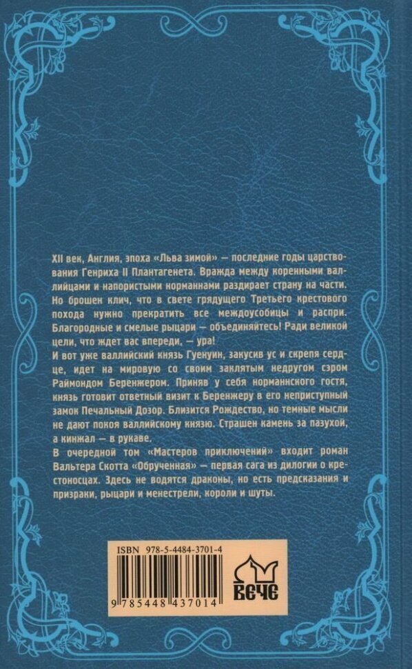 В очередной том "Мастеров приключений" входит роман Вальтера Скотта "Обрученная" - первая сага из дилогии о крестоносцах. Здесь не водятся драконы, но есть предсказания и призраки, рыцари и менестрели, короли и шуты.