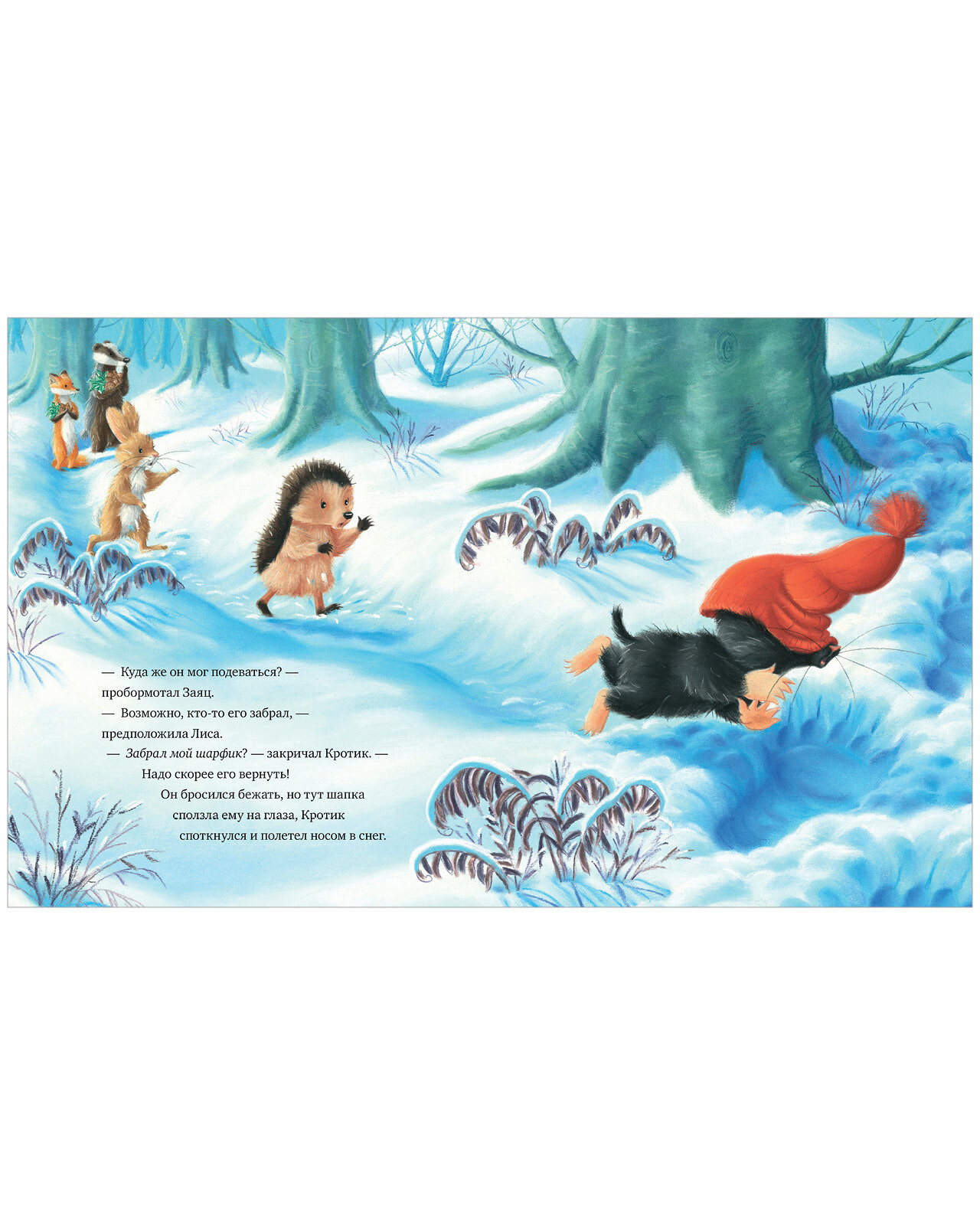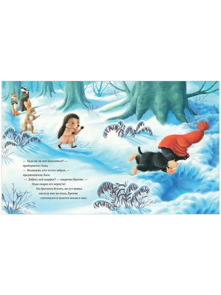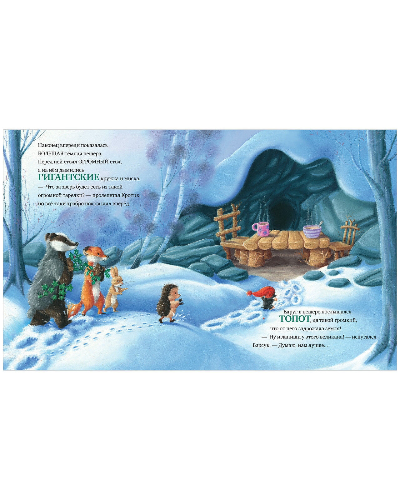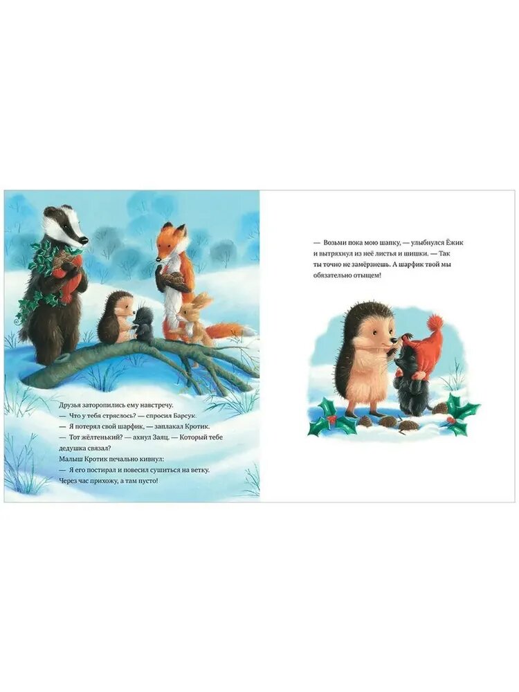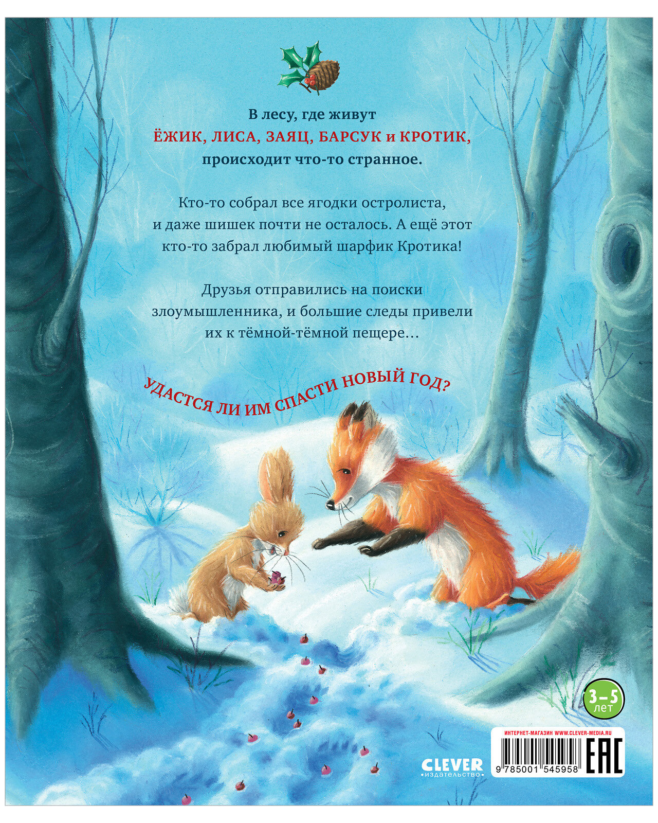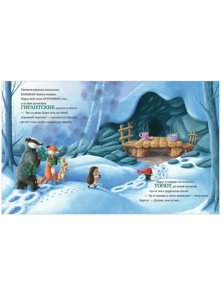 В лесу, где живут Ежик, Лиса, Заяц, Барсук и Кротик, происходит что-то странное. Кто-то собрал все ягодки остролиста, и даже шишек почти не осталось. А еще этот кто-то забрал любимый шарфик Кротика! Друзья отправились на поиски злоумышленника, и большие следы привели их к темной-темной пещере… Удастся ли им спасти Новый год?