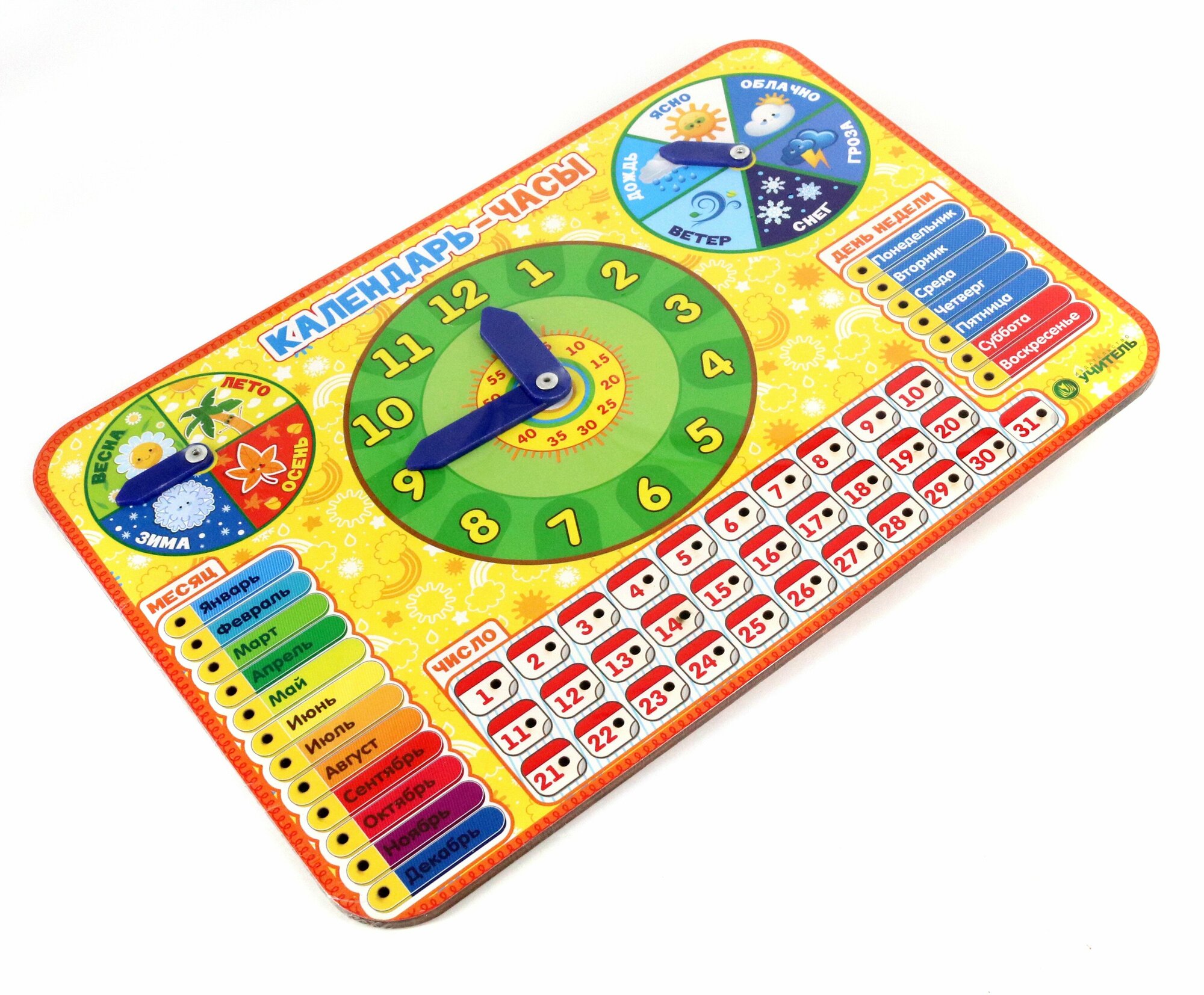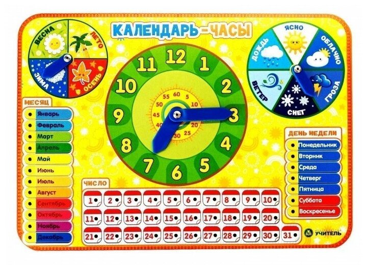Часы-календарь - это многофункциональная развивающая игрушка для знакомства малыша с временем. Игрушка представляет собой красочный деревянный планшет с подвижными стрелками и съёмными пластиковыми деталями-указателями. Изображение разделено на несколько тематических зон, которые знакомят с временем, датой, месяцами, днями недели, временем года, погодными условиями. Игра с планшетом предполагает выбор в каждой зоне определенного пункта, фиксирование его с помощью стрелок или пластикового указателя. Игры и занятия с игрушкой "Часы-календарь" помогут ребенку в развитии мышления, памяти, воображения, зрительного и тактильного восприятия, в формировании любознательности, терпения, усидчивости и познавательной активности. Часы-календарь станут любимой игрушкой вашего ребенка, а также не заменим пособием в получении важных знаний в категории время.