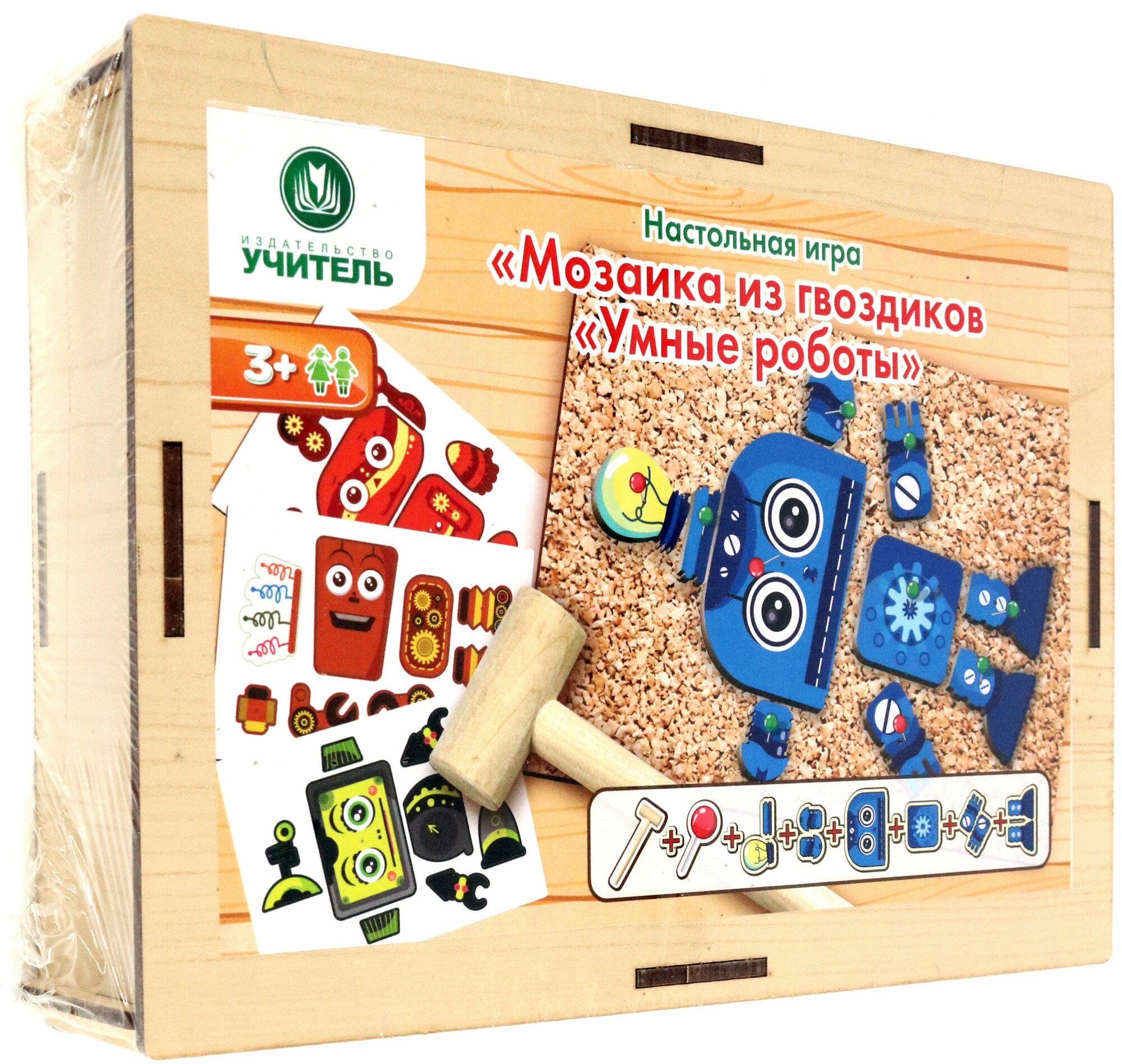 Мозаика из гвоздиков "Умные роботы" - это многофункциональная развивающая игрушка. Она состоит из 4-х вариантов сборной мозаики, схем сборки, пробкового полотна, гвоздиков и молоточка. Задача ребенка с помощью гвоздиков и молоточка на пробковое полотно крепить элементы мозаики. Для подсказки можно использовать готовые схемы или собрать свое собственное изображение. Процесс крепления предметов с помощью гвоздиков увлекает ребенка на долгое время, а большое количество взаимозаменяемых элементов, увеличивающих варианты сборки, положительно влияет на развитие фантазии и творческих способностей. Игры и занятия с мозаикой из гвоздиков развивают память, мышление, внимание, воображение, стимулируют координацию движения и развитие мелкой моторики рук, формируют усидчивость и любознательность. Мозаика из гвоздиков "Умные роботы" - уникальная игрушка, которая не смотря на свою простоту исполнения, способна подарить ребенку массу положительных эмоций.