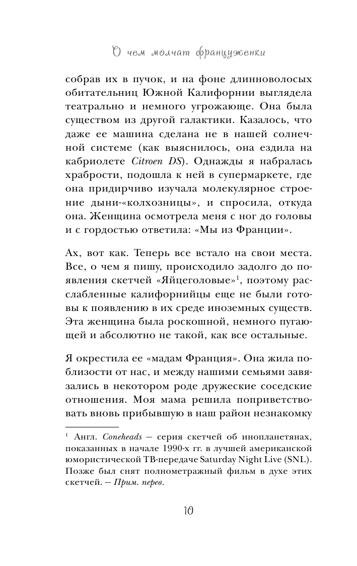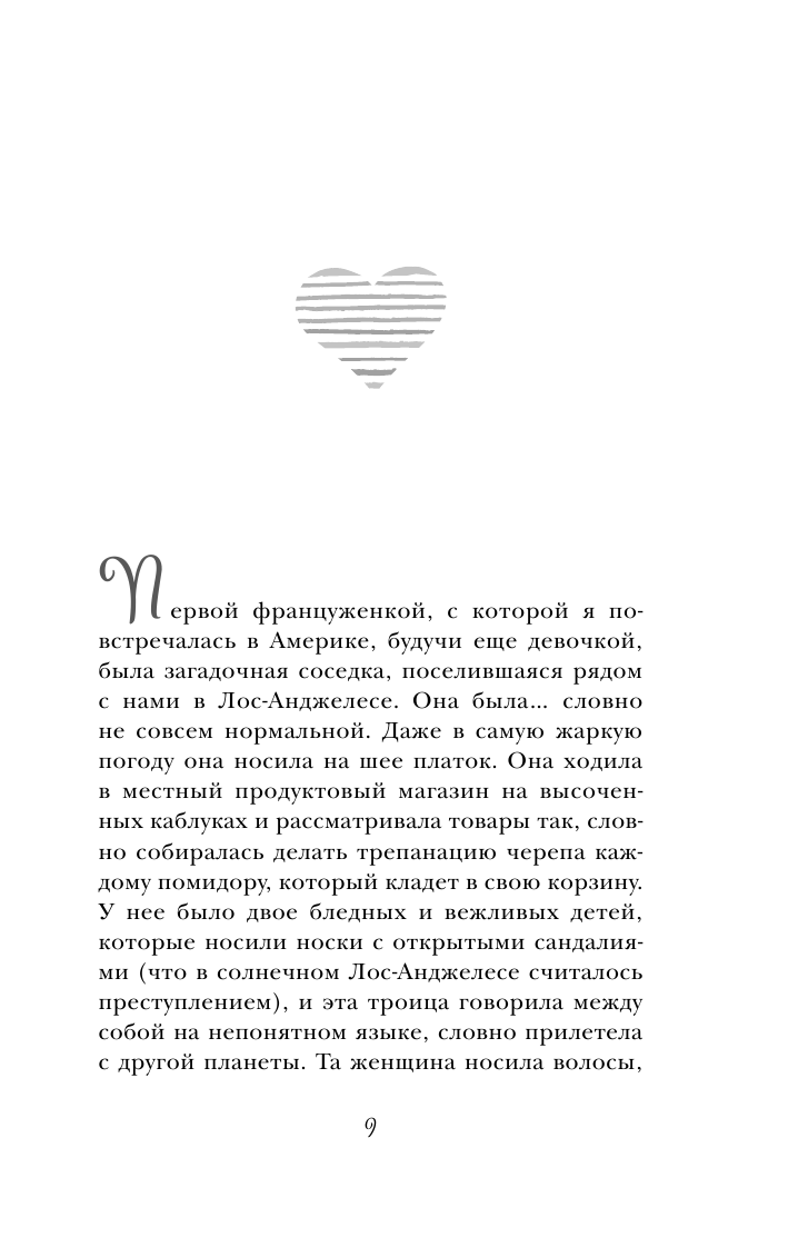 Автор- американка, она описывает француженок как бы со стороны. Сравнивает американок и француженок, и сравнение очень часто не в пользу американок. Книга этим сравнением в частности и интересна, ведь граждане России и американки и француженка, тоже разные. Читать интересно. Книга лёгкая, приятная обложка, можно брать в дорогу, поместится даже в небольшую сумку. Но бумага серая, хотя текст и чёткий.