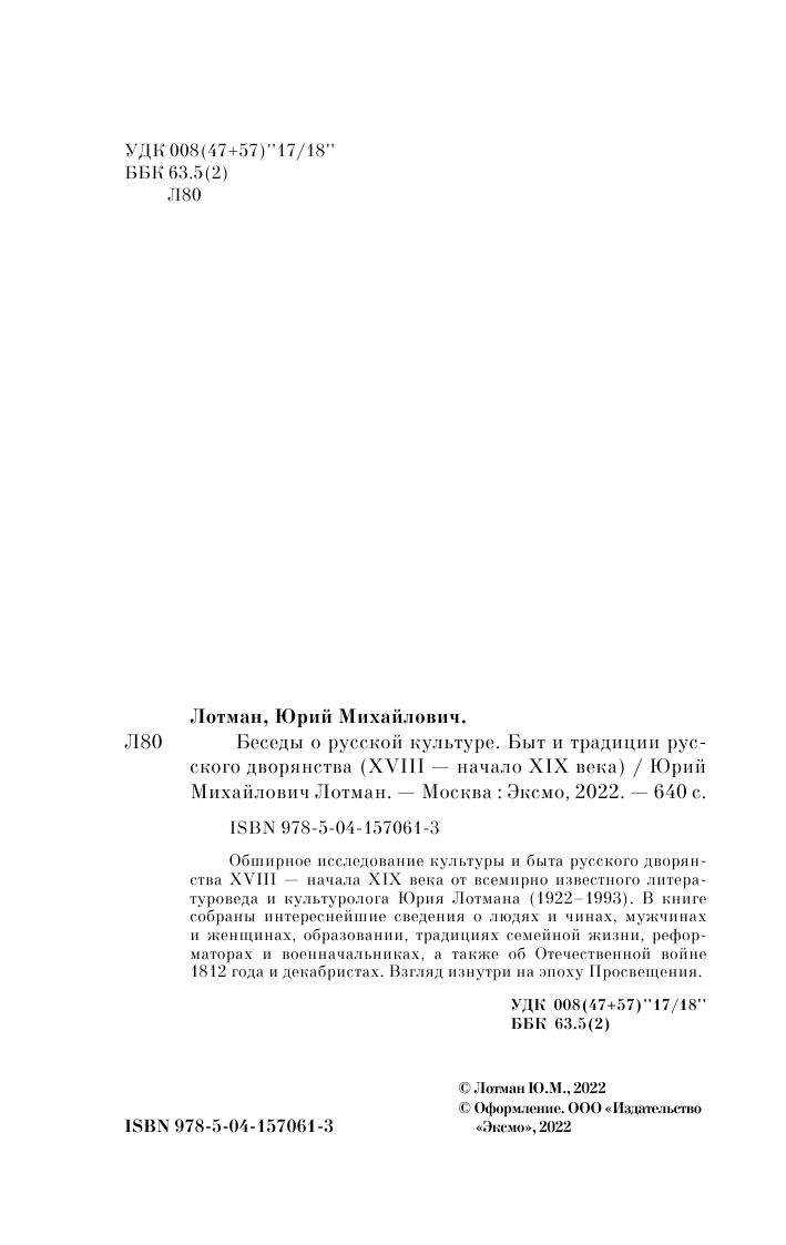 Беседы о русской культуре. Быт и традиции русского дворянства (XVIII-начало XIX века) (Юрий Михайлович Лотман); Эксмо, 2022