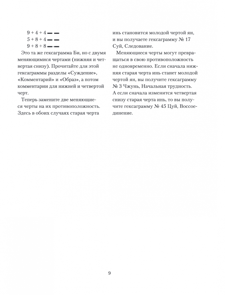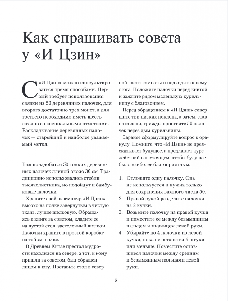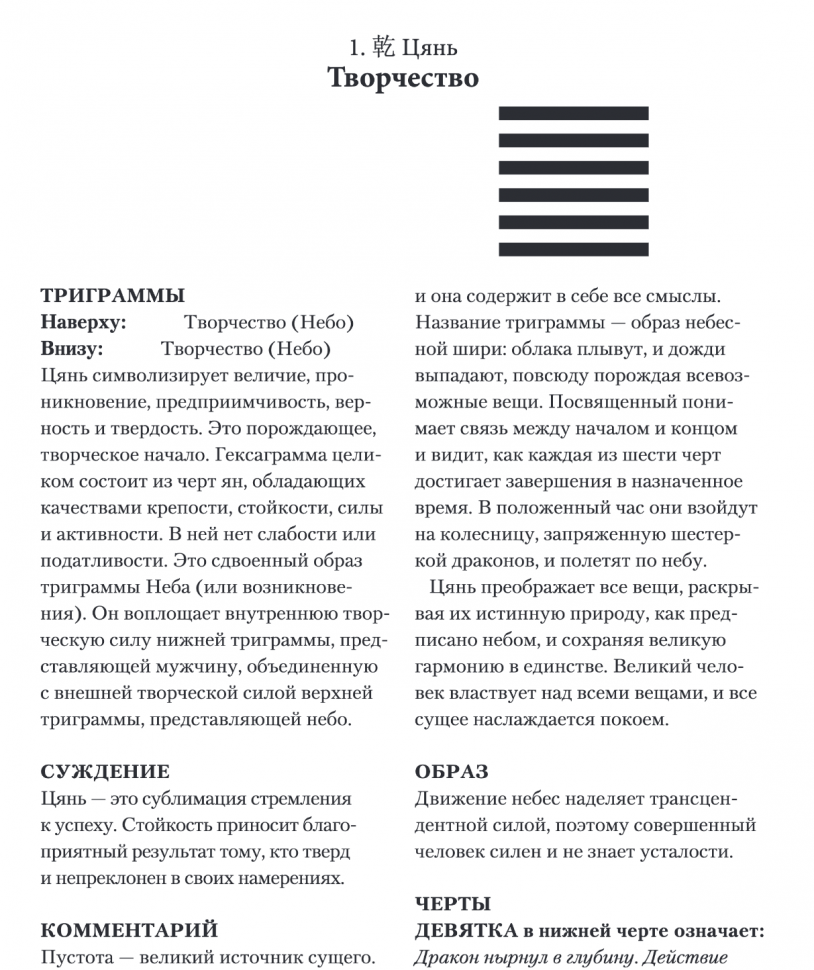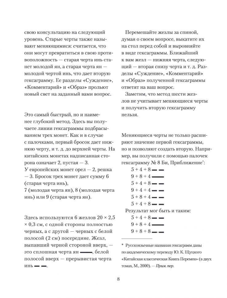 На страницах этого проекта представлены три вида гаданий: метод трех монет, метод 50-ти палочек и метод шести жезлов. Каждая гексаграмма сопровождается несколькими текстами, пришедшими к нам из разных эпох.
