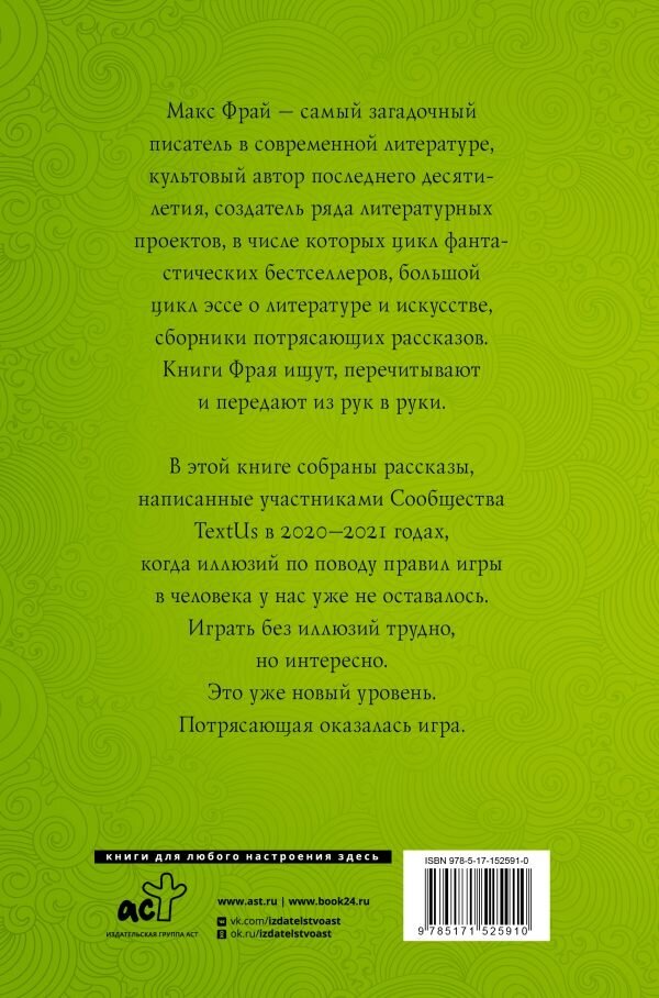 Макс Фрай - самый загадочный писатель в современной литературе, культовый автор последнего десятилетия, создатель ряда литературных проектов, в числе которых цикл фантастических бестселлеров, большой цикл эссе о литературе и искусстве, сборники потрясающих рассказов. Книги Фрай ищут, перечитывают и передают из рук в руки. В этой книге собраны рассказы, написанные участниками общества TextUs в 2020—2021 годах, когда иллюзий по поводу правил игры в человека у нас уже не оставалось. Играть без иллюзий трудно, но интересно. Это уже новый уровень. Потрясающая оказалась игра.