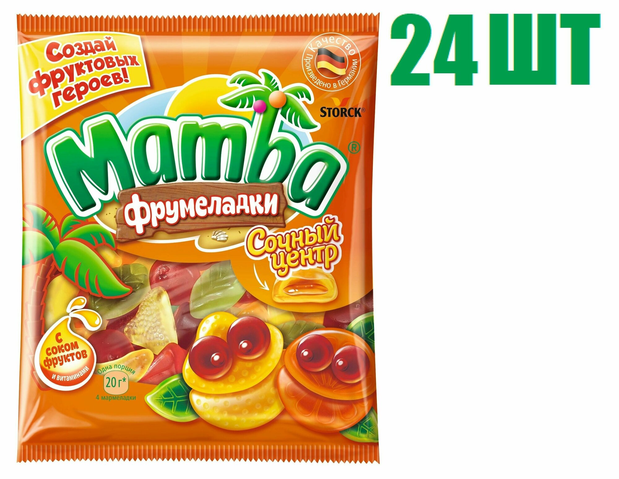 Mamba Фрумеладки - вкусные жевательные мармеладки c фруктовым соком и витаминами! Насладись отличным вкусом и получи заряд веселья и прекрасного настроения! А самое интересное ты можешь с ними играть! Создай свой мир фруктовых героев Mamba Фрумеладки, складывая мармеладки различных форм и превращая их в новых веселых персонажей. Собери свою команду героев с острова Mamba! Mamba Фрумеладки Сочный центр - жевательный мармелад с начинкой из фруктового сока (22%), обогащенный витаминами.
