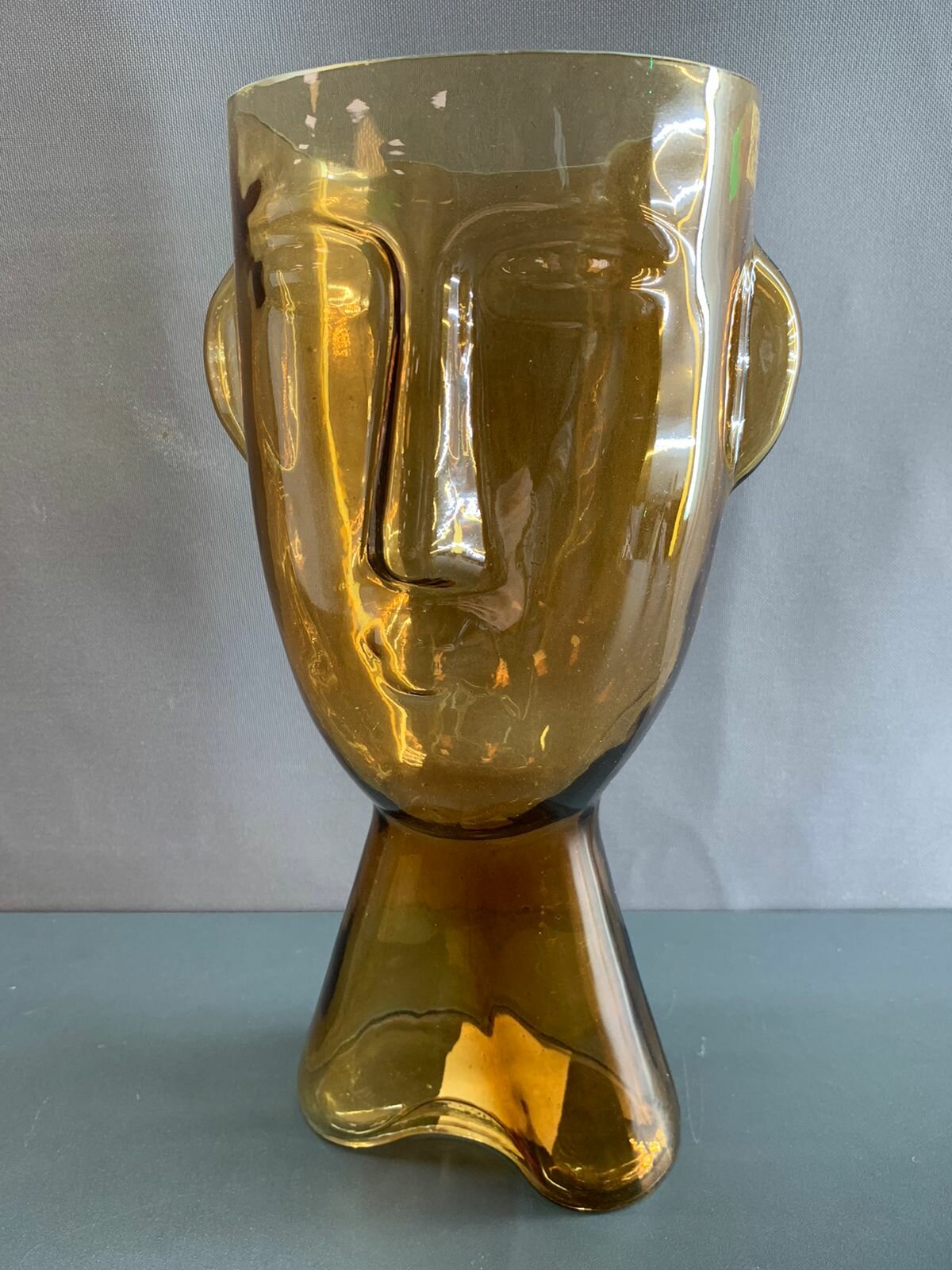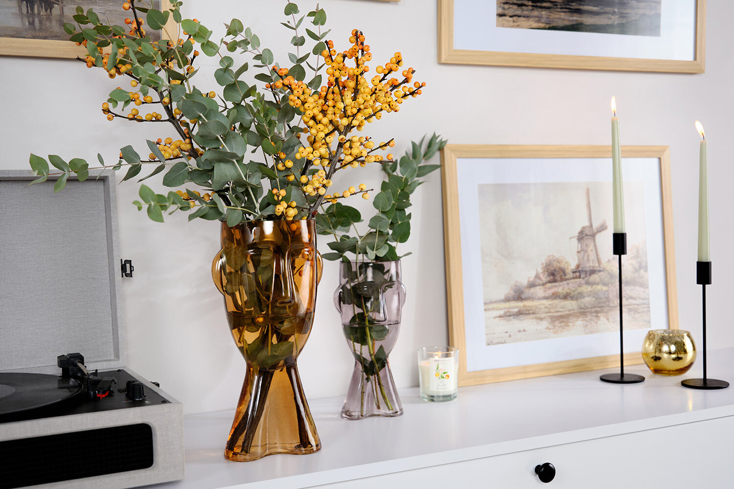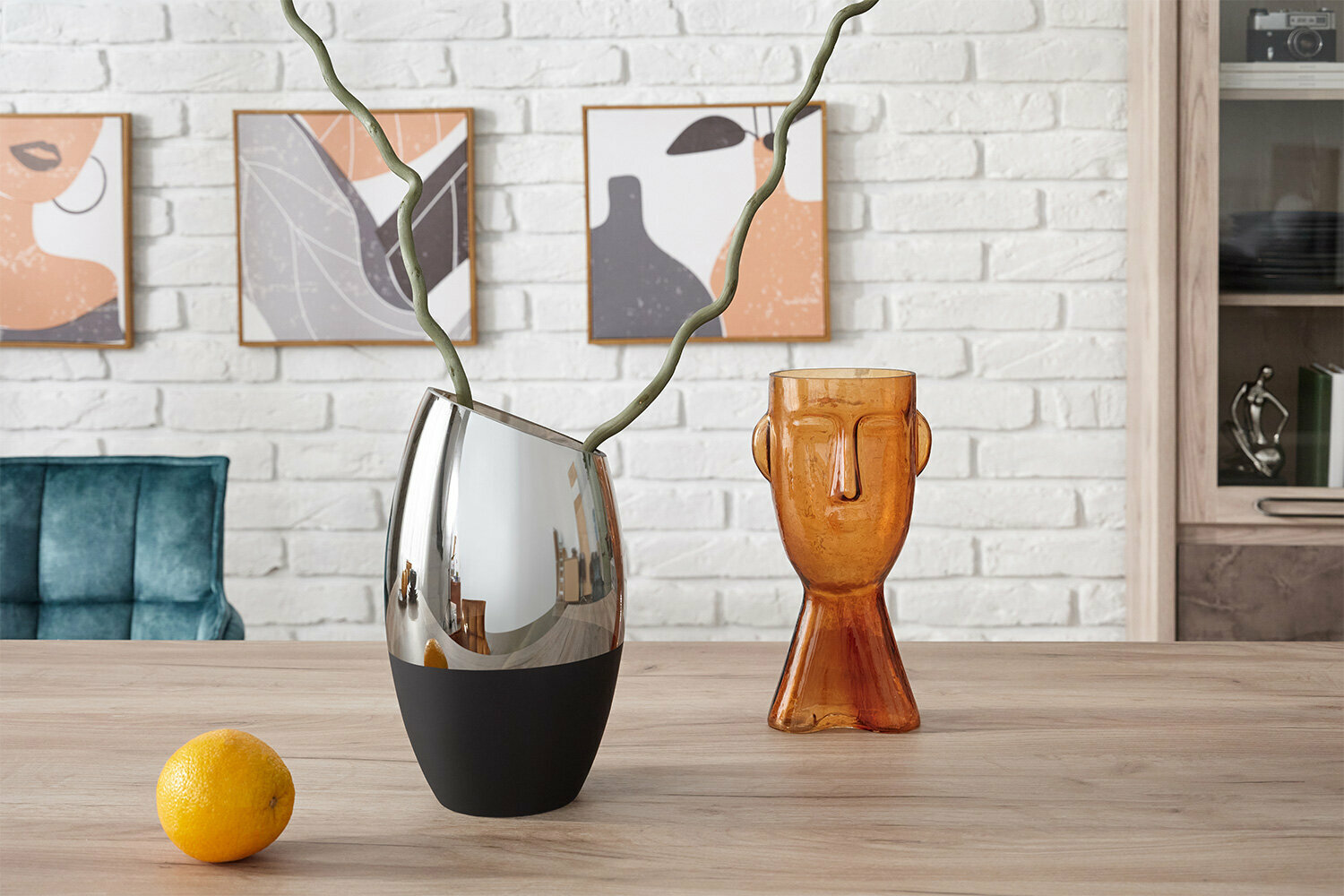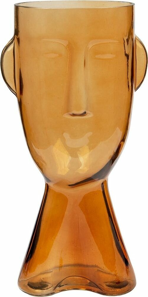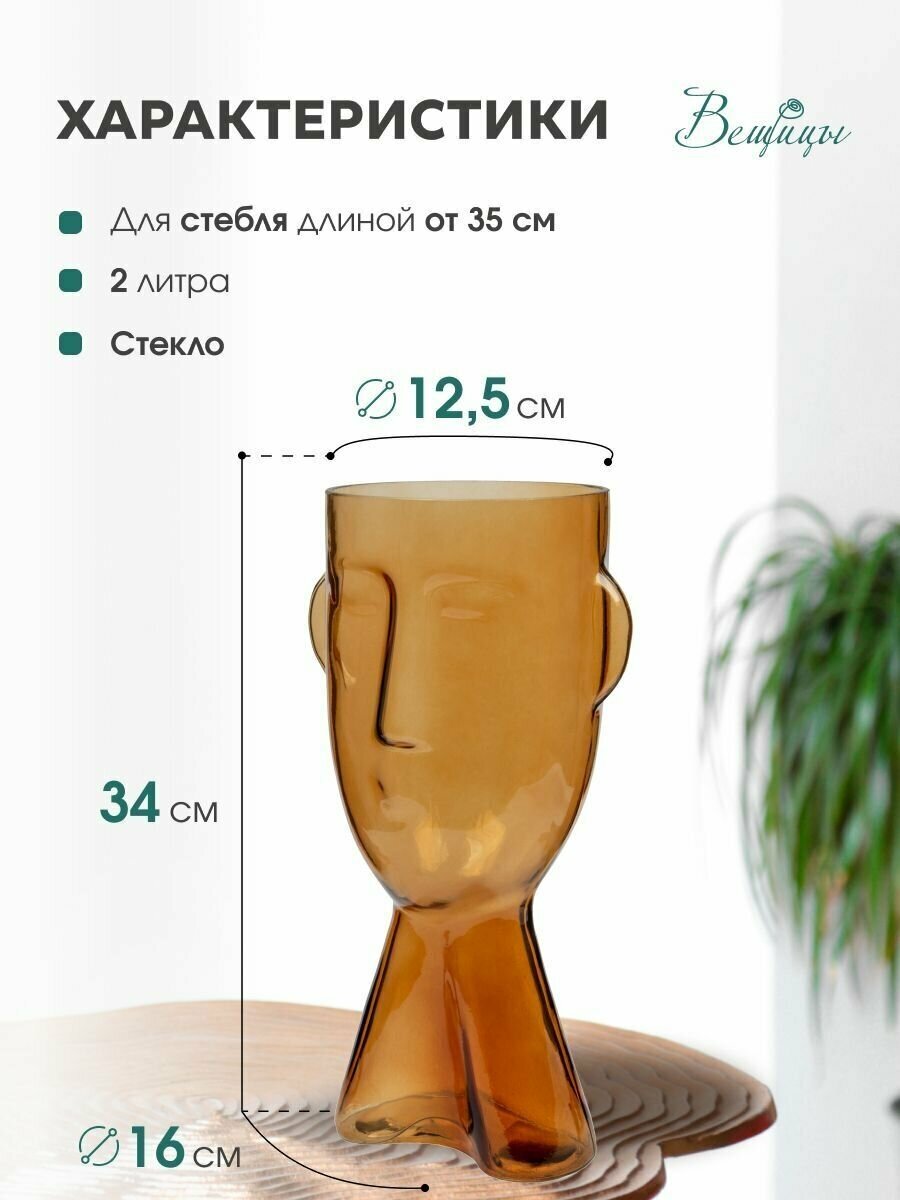 Настольная ваза Фейс – скорее арт-объект, чем чисто функциональная емкость для размещения букета. Сосуд выполнен в виде головы человека и представляет самостоятельную эстетическую ценность, даже не будучи заполненным живыми цветами или ветками. Подчеркнуть оригинальность формы можно с помощью декоративной зелени: композиция из стеблей аспарагуса, гипсофилы или папоротника будет смотреться как пышная шевелюра загадочного персонажа. Беспокоиться о сохранности стеклянного аксессуара нет причин – широкое основание делает его устойчивым на любой горизонтальной поверхности.