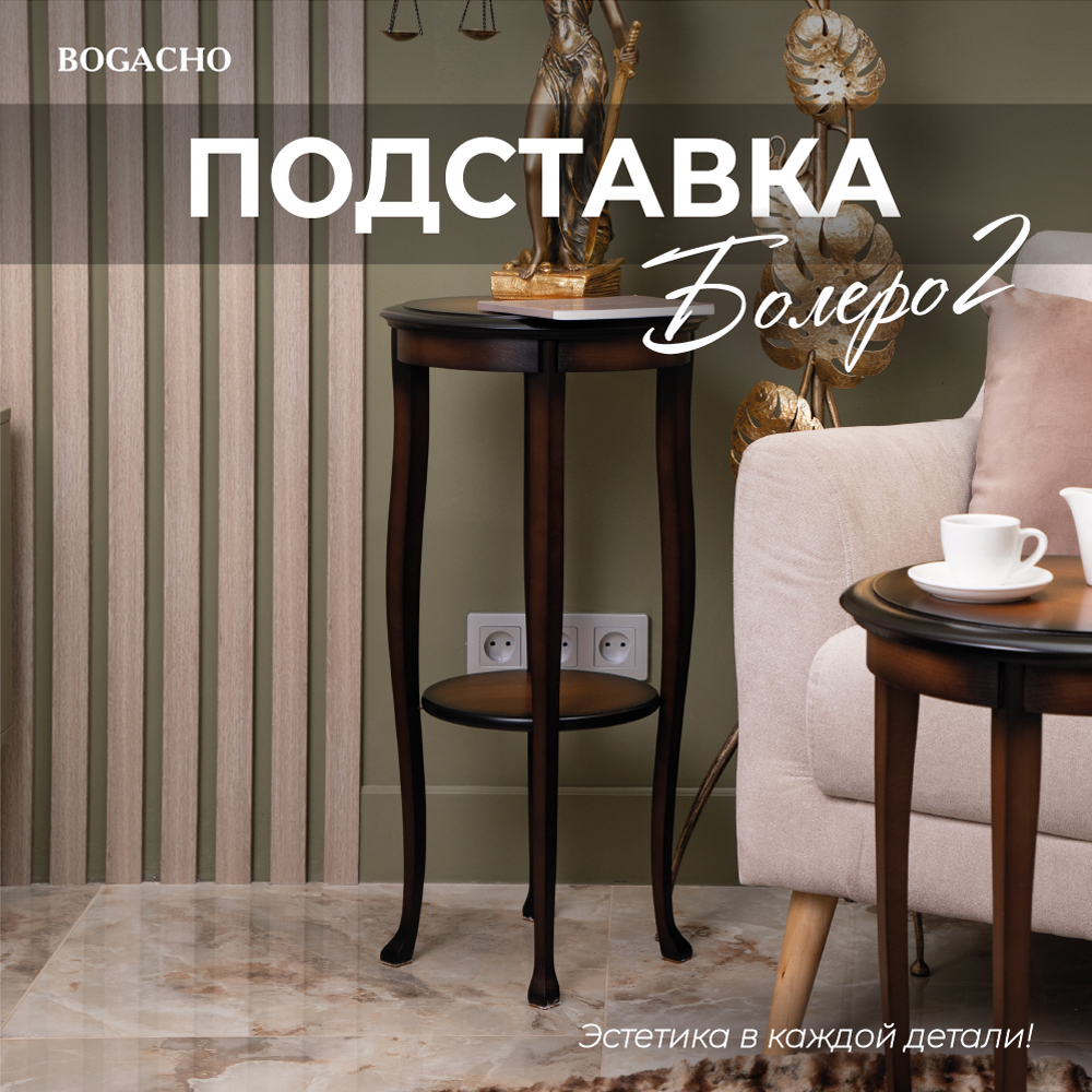 Болеро – название испанского народного танца, который покорил тысячи людей по всему миру. А ещё это одно из самых известных произведений талантливого композитора Мориса Равеля, вдохновлённого этим ярким и насыщенным танцем. Как и одноимённый танец, подставка Болеро – это полёт фантазии, свобода, гармоничность и деликатность. Изогнутые линии, аккуратная столешница, благородные породы дерева – бук и дуб, надёжность и устойчивость – это добросовестная работа искусных мастеров BOGACHO. Эксклюзивность и премиальность подставки Болеро не разочаруют даже самых искушённых ценителей красивой мебели, ведь это кропотливая ручная работа. Испания – страна солнца, музыки, улыбок и спелых фруктов. Теплые дни, веселье и любовь к искусству олицетворяют жизнь в этой стране, и мы считаем, что мастерам удалось передать в своём творении настоящее испанское настроение! Яркий букет или интересная статуэтка, чайный сервиз или ароматная чашечка кофе, а может быть и ваза с фруктами – подставка Болеро не только красива, но и практична. Купите подставку Болеро от BOGACHO, и Ваш интерьер преобразится!