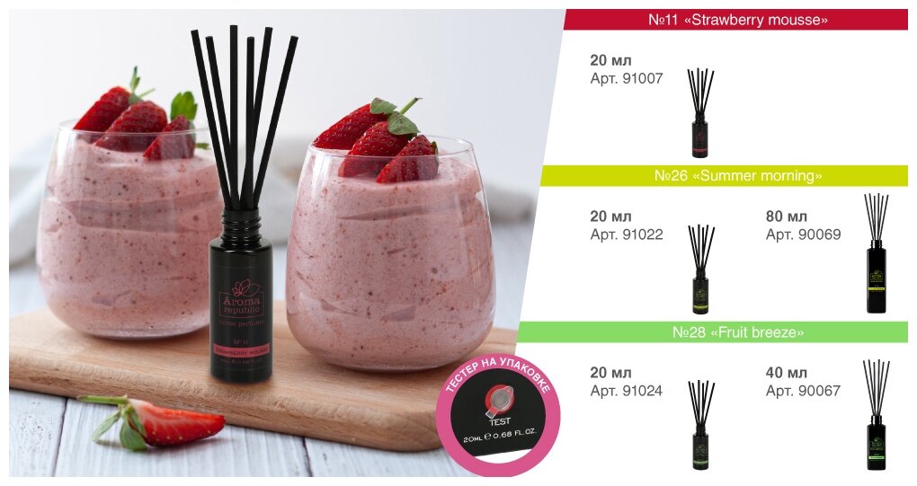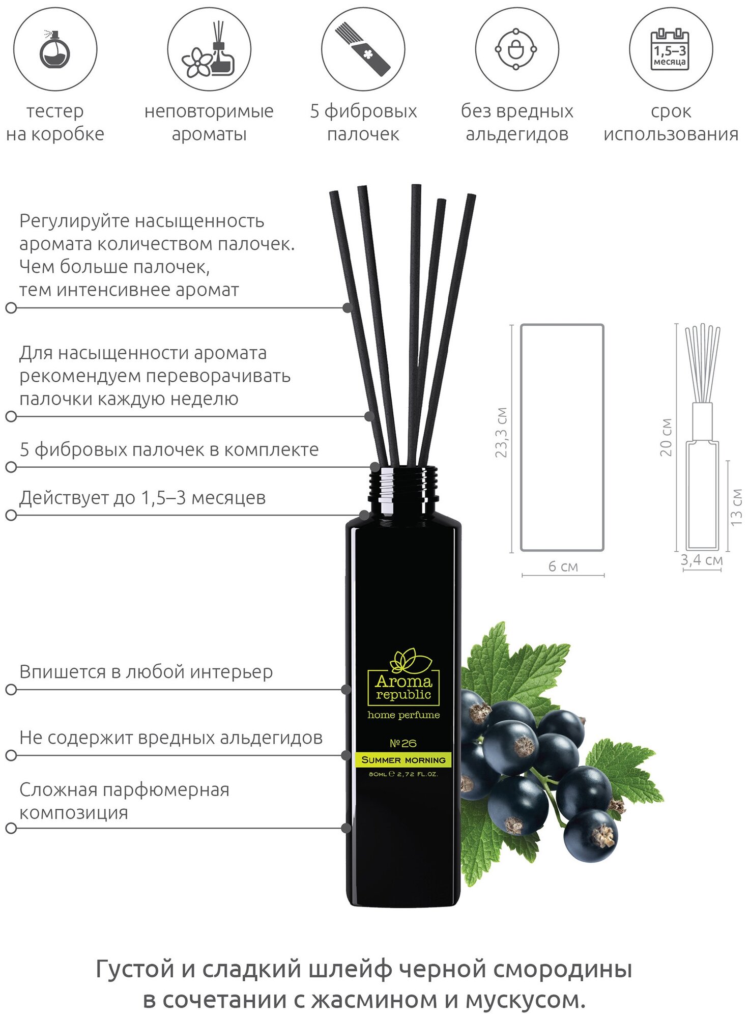 Aroma Republic Ароматический диффузор №26 Summer morning 80 мл Густой и сладкий шлейф черной смородины в сочетании с жасмином и мускусом. Разнообразие ароматов, помогут создать в вашем доме атмосферу уюта и семейного праздника. Способ применения: Снимите крышку Поместите палочки во флакон Регулируйте интенсивность аромата количеством палочек Переворачивайте палочки один раз в неделю. Предназначение: Средство для ароматизации воздуха в помещении