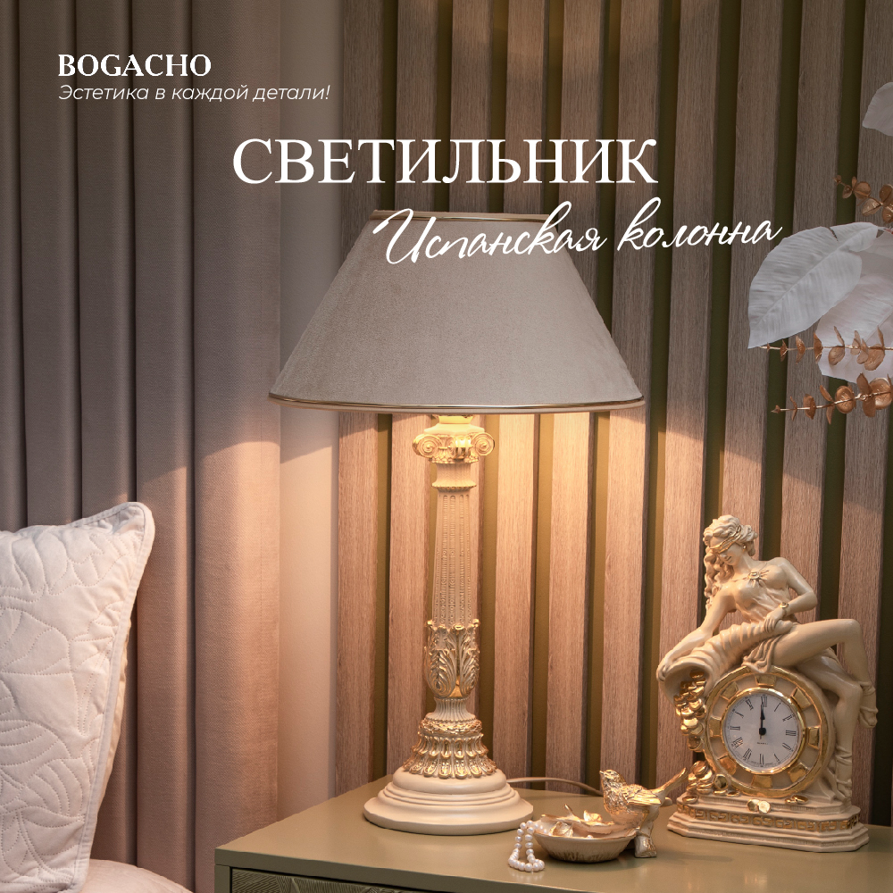 Настольная лампа BOGACHO - это изделие изящного искусства и высочайшего качества. Декоративный светильник помимо освещения, подсветки для комнаты, является неповторимым предметом декора для дома и уюта. Светильник подойдет в любое пространство жилой зоны дома, дачи, квартиры (светильник в спальню, в прихожую, в гостиную, в детскую, в зал) и даже в салон красоты, ресторан, отель. Также используется как ночник, ночной светильник, на прикроватную тумбу, на туалетный столик, прикроватный светильник. Лампа с абажуром - это оригинальный подарок маме, на новый год, рождество, подруге, мужчине, девушке, папе, на день рождения, бабушке, мужу, женщине, сестре, на день матери, на годовщину, на 8 марта, на 14 февраля, новоселье. Светильник для дома отлично подойдет в интерьер в стиле лофт, сканди, минимализм, эклектика, романтизм.