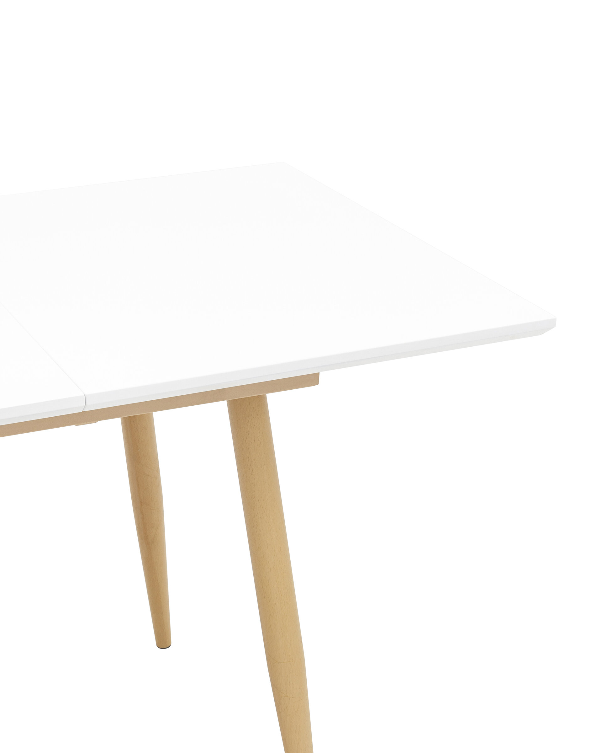 Обеденный стол в прямоугольной столешницей. Цвет столешницы белый. Ножки металлические, покрашены в цвет светлого дерева. Подходит для большой компании. Ширина стола 120-160 см, так как стол дополнительно раскладывается на 40 см. Высота стола - 75 см.