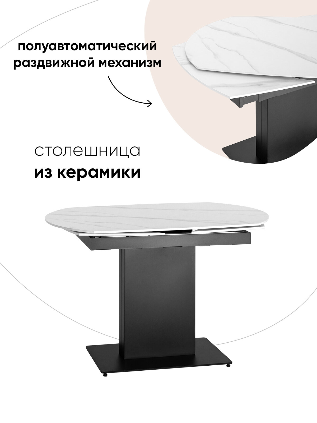 Лаконичный обеденный стол с полуавтоматическим раздвижным механизмом. Столешница выполнена из цельной керамики, повторяющий рисунок благородного черного мрамора. Прочная и долговечная керамика выдерживает перепады температуры и механические воздействия. Стол оснащён простым и элегантным раздвижным механизмом, достаточно повернуть центральную часть на 180 градусов и зафиксировать между боковыми панелями. Таким образом, при необходимости, можно увеличить полезную площадь стола на 60 см. Металлический каркас с монолитной ножкой надежно удерживает всю конструкцию. Основание каркаса оснащено заглушками, которые не позволяют металлическим частям соприкасаться с полом и портить покрытие при перемещении.