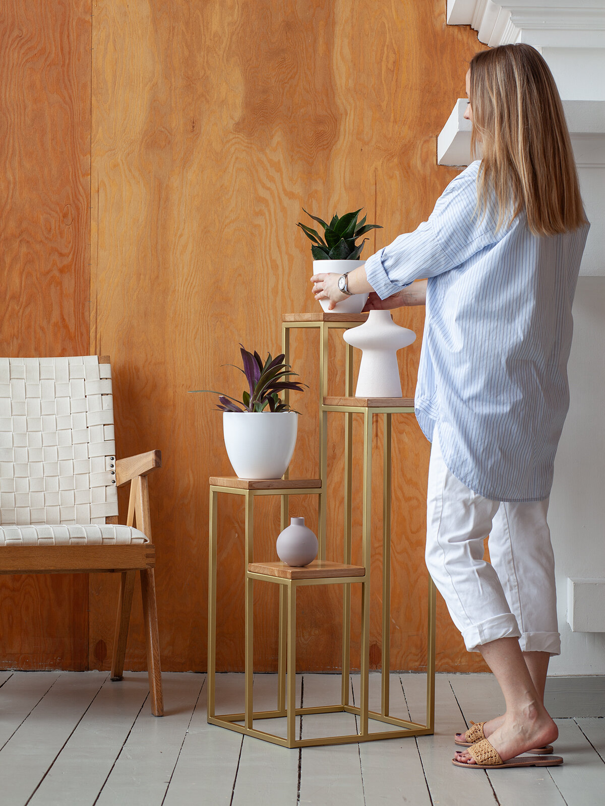 Геометричная подставка под растения от GreenWeen позволит разместить 4 средних кашпо. Расположение столиков на разном уровне дает возможность установить растения разной высоты, расставив их так, чтобы это было не только красиво, но и не вредило растениям. Отлично впишется в любой интерьер. Верхняя полка располагается на высоте 1 метра от пола. Полки выдерживают до 10 кг. Изготовлено на своем производстве.