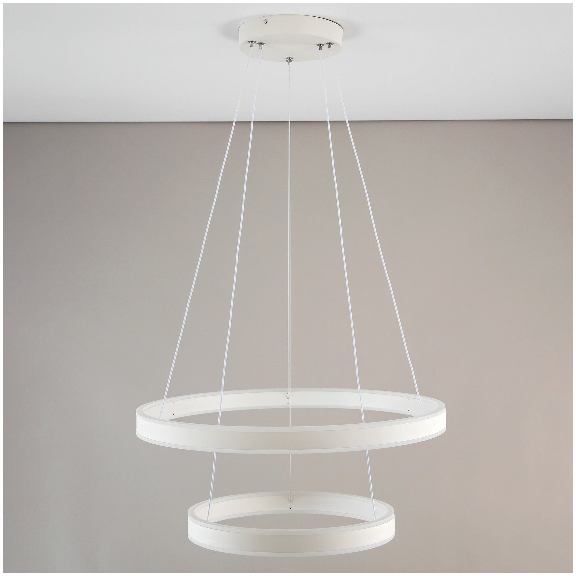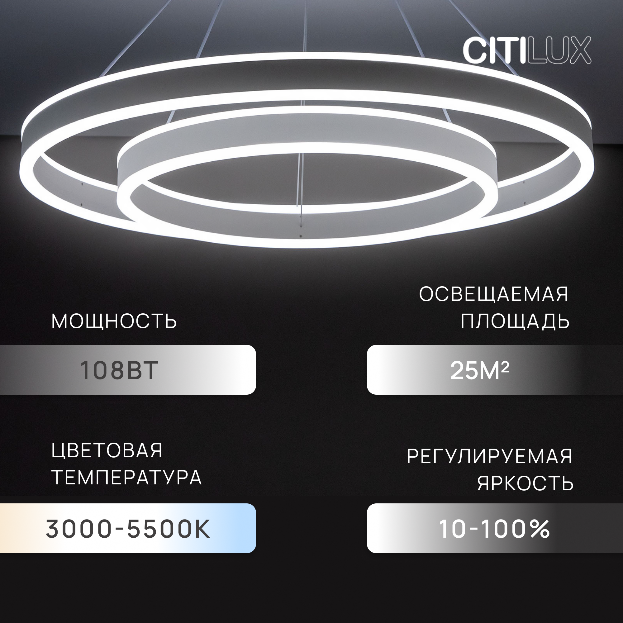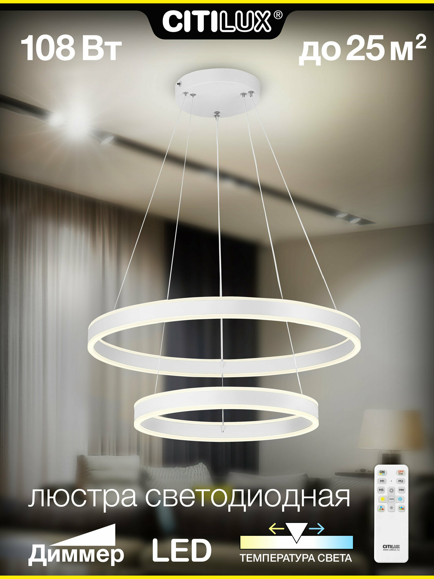 Светодиодная люстра Citilux Дуэт CL719640 в современном стиле, цвет белый. Люстра на тросах в форме каскада из двух подвесных колец, высоту и угол наклона каждого из которых можно легко изменить. Кольца изготовлены из алюминиевого профиля с рассеивателем из оптического полимера. Наличие источников света с двух сторон профиля позволяет равномерно осветить всё помещение. Крепление подходит для всех типов потолков, в том числе натяжных. Тип крепления – планка. Мощность 108Вт. Диаметр 60см, высота 120см. Модель управляется пультом дистанционного управления. Пульт ДУ в комплекте, тип батареек ААА (батарейками не комплектуется). Доступно: плавная регулировка яркости от 10 до 100%; управление цветовой температурой от 3000К до 5500К, можно настроить любые оттенки теплого, нейтрального и холодного света. Есть четыре настраиваемых режима памяти, от М1 до М4, которыми также можно управлять настенным выключателем. Люстра Citilux Дуэт CL719640 ярко осветит помещения как с высокими, так и с низкими потолками площадью до 25м².