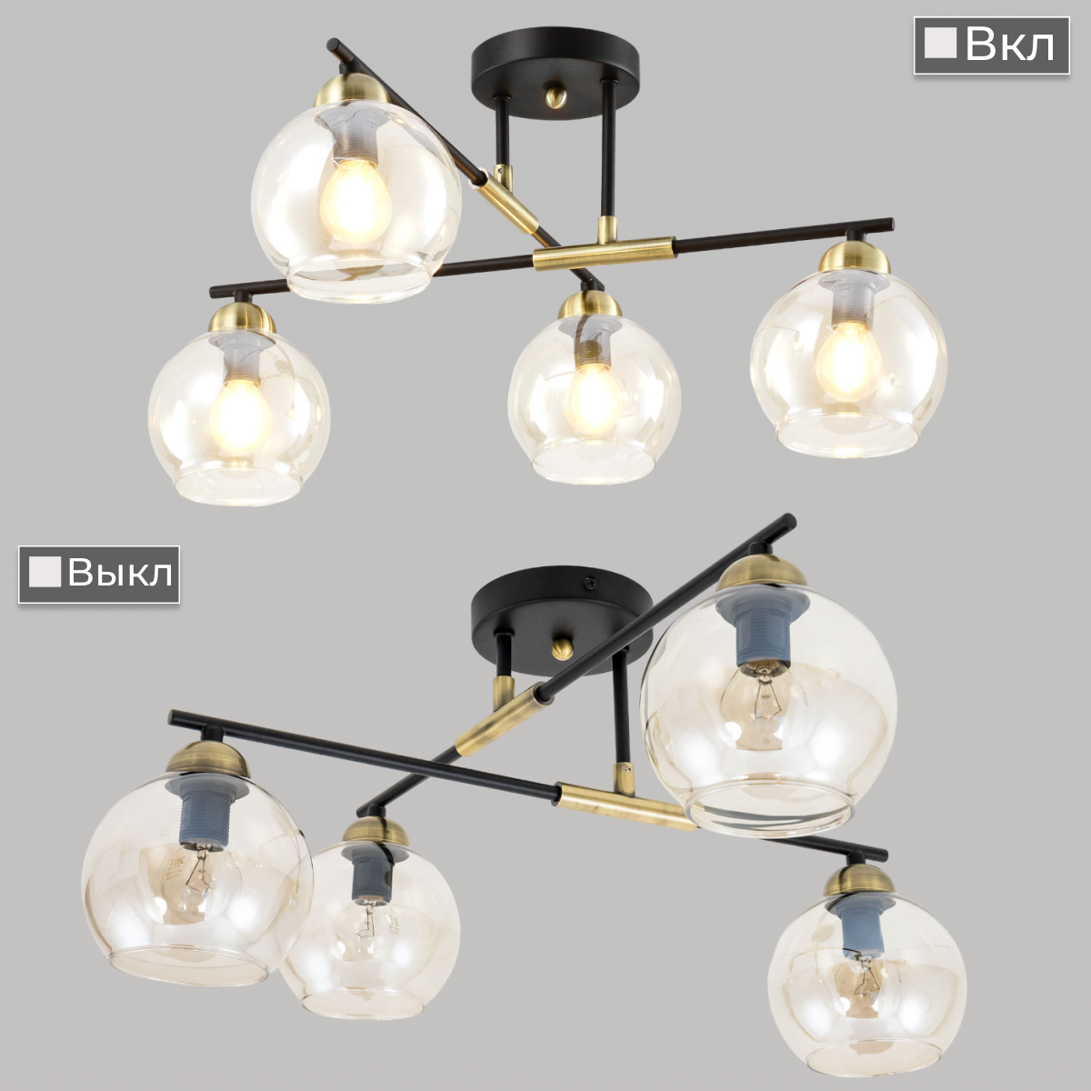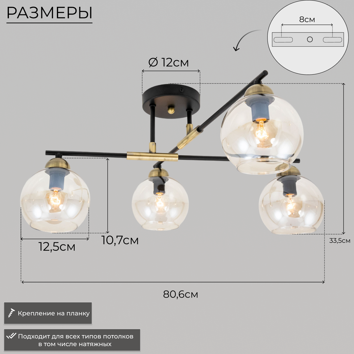 Потолочная люстра Citilux Анри CL124145 в современном стиле. Корпус светильника металлический, чёрного цвета, с декоративными бронзовыми элементами. Основание круглой формы, рожки-штанги расположены параллельно потолку. Плафоны изготовлены из прозрачного стекла светло-янтарного оттенка. В изделии используются лампы с цоколем Е14, максимальной мощностью для ламп накаливания 60Вт. Светодиодные лампы можно устанавливать более яркие. Поставляется в компактной упаковке, в виде набора для самостоятельной сборки. Крепёж и подробная инструкция в комплекте. При сборке, рожки-штанги можно закрепить в разных положениях, создав свой неповторимый дизайн. Подходит для всех типов потолков, в том числе натяжных, тип крепления – планка. Площадь освещения около 14м².
