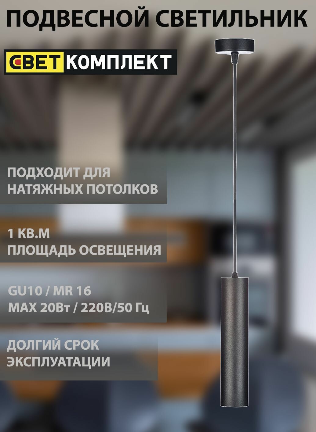 Подвесной светильник Светкомплект цилиндр D55мм GU10 черный, провод 1,5м P51A. D55. B оборудован керамическим патроном, который устойчив к воздействию высоких температур. Изделие отлично подойдет для освещения барных стоек и интерьерных ниш.
