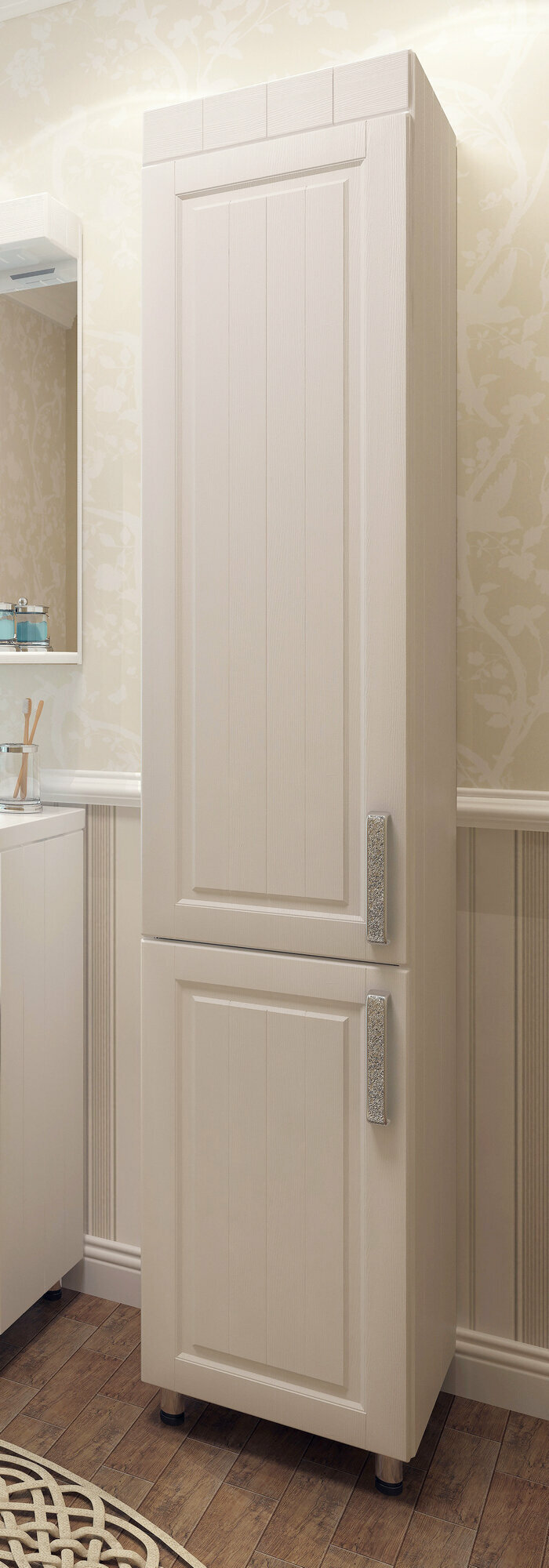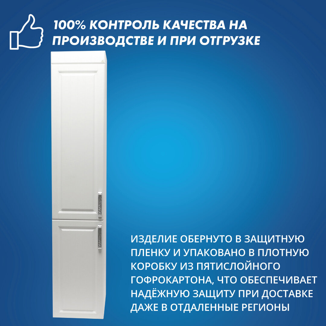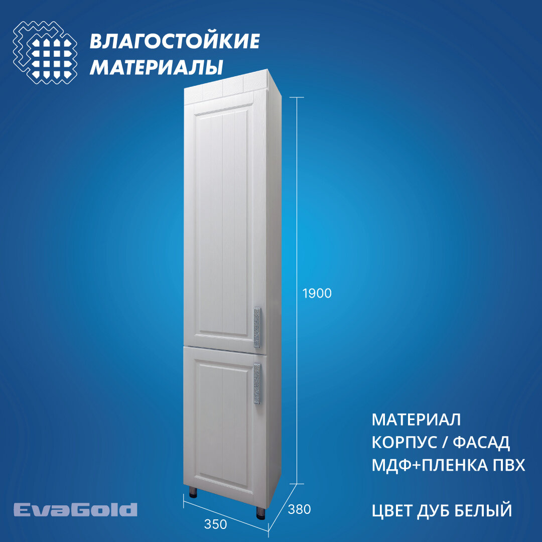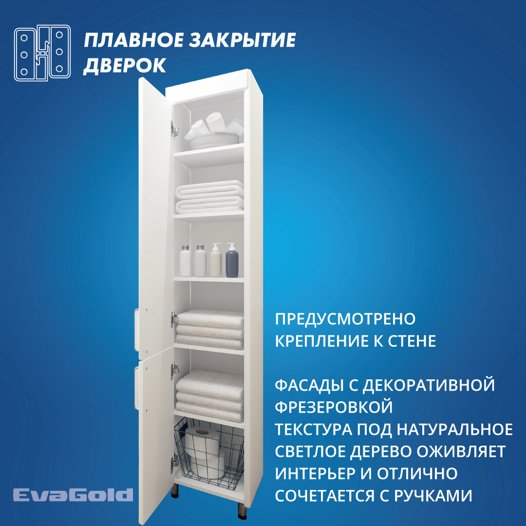 Шкаф для ванной EvaGold 35 напольный белый - это не просто мебель, это настоящее произведение искусства.Шкаф выполнен в классическом стиле, что делает его актуальным и модным элементом интерьера. Белый цвет корпуса и фасада придает шкафу легкость и воздушность, а также позволяет ему гармонично вписаться в любой интерьер.Размеры шкафа составляют 190 см в высоту, 35 см в ширину и 38 см в глубину, что позволяет разместить в нем все необходимые вещи. Конструкция шкафа - пенал, с двумя складными дверями и шестью секциями.Материал корпуса и фасада - ЛДСП и МДФ соответственно. Фурнитура выполнена из металла, что гарантирует прочность и долговечность шкафа.Особенностью шкафа является наличие доводчиков, которые обеспечивают плавное и бесшумное закрывание дверей. Это не только удобно, но и продлевает срок службы шкафа, предотвращая преждевременный износ петель и других элементов.Шкаф оснащен четырьмя полками, что позволяет максимально эффективно использовать пространство.Установка шкафа напольная, что обеспечивает его устойчивость и надежность.Производство шкафа осуществляется в России, что гарантирует высокое качество и соответствие всем стандартам.
