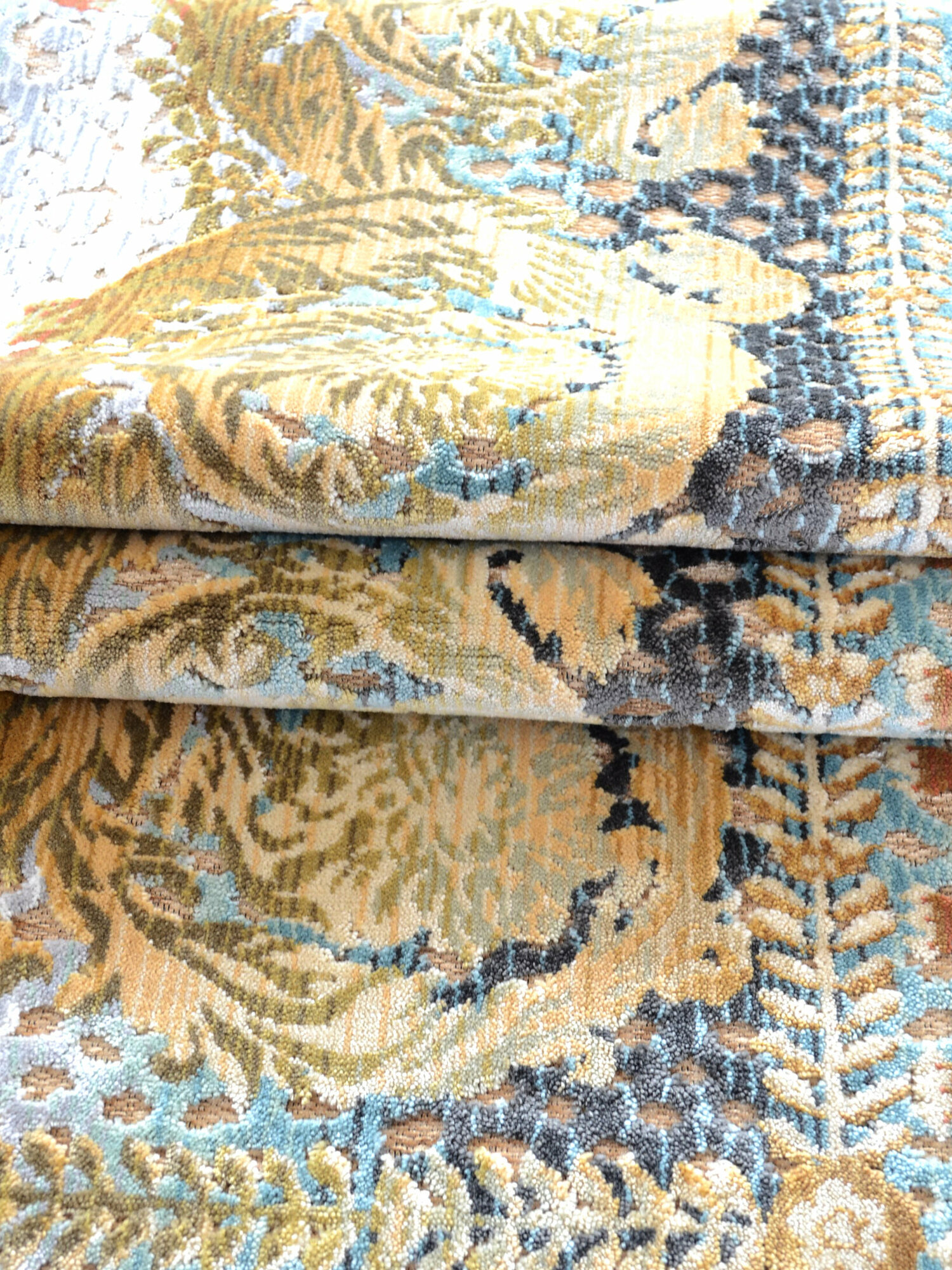 В настоящее время жаккардовые тканые ковры становятся очень популярными, они похожи на гобелены, где используется большое количество цветных нитей и многообразная тематика узоров. Из всех ковров машинного способа производства жаккардовые тканные ковры являются самыми качественными, плотными и дорогостоящими. С изнаночной стороны просматривается рисунок, который создает иллюзию изготовленных вручную ковров. Коллекция "Симфония" произведена из вискоза шениловой нити. Из-за особого способа плетения шениловой нити, которая накручивается вокруг основы или оплетается пушистыми волокнами, образуется долговечная, прочная нить с приятной бархатистой структурой. Для создания эффекта легких ажурно-рельефных ковров использовали две фактуры, причем сочетали разные участки ворсового и безворсового полей. Цветовая гамма - сочетание ярких и приглушенных оттенков, с плавными переходами буквально завораживают. Коллекцию "Симфония" с легкостью выбирают для классических и современных интерьеров. Обратите внимание! В связи с технологическими особенностями производства, рисунок может видоизменяться в зависимости от размера и формы изделия.