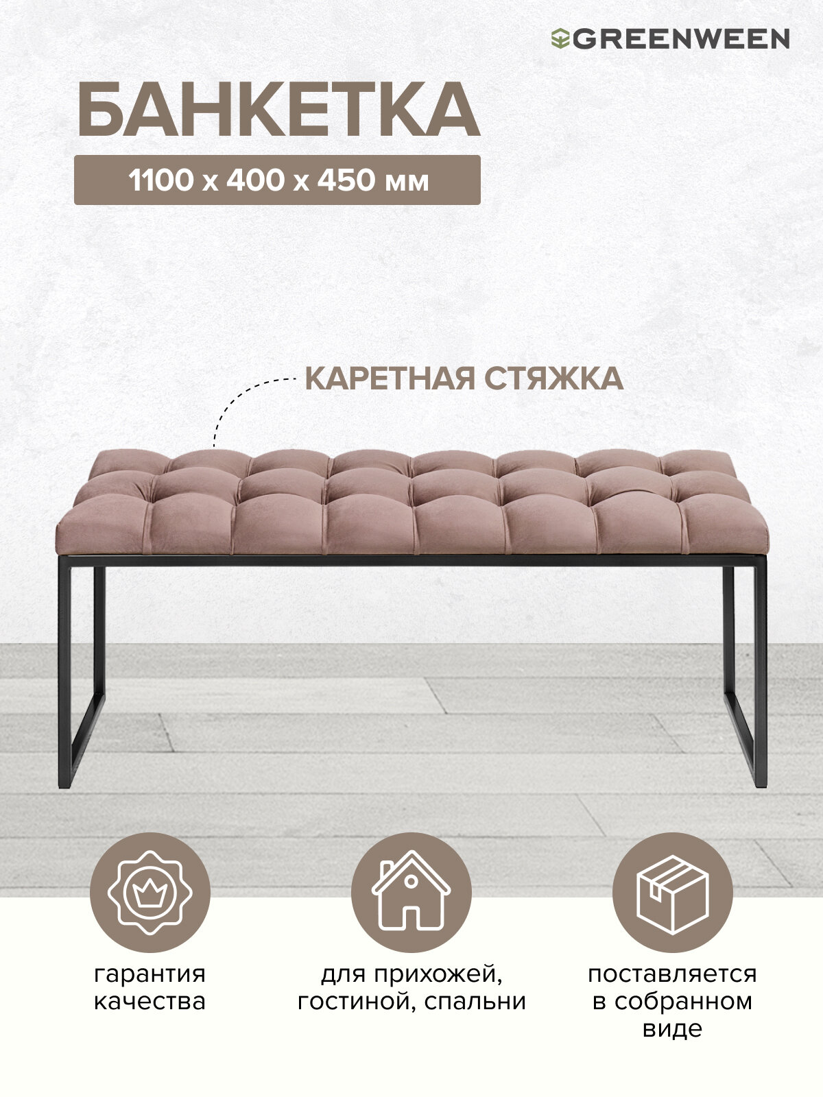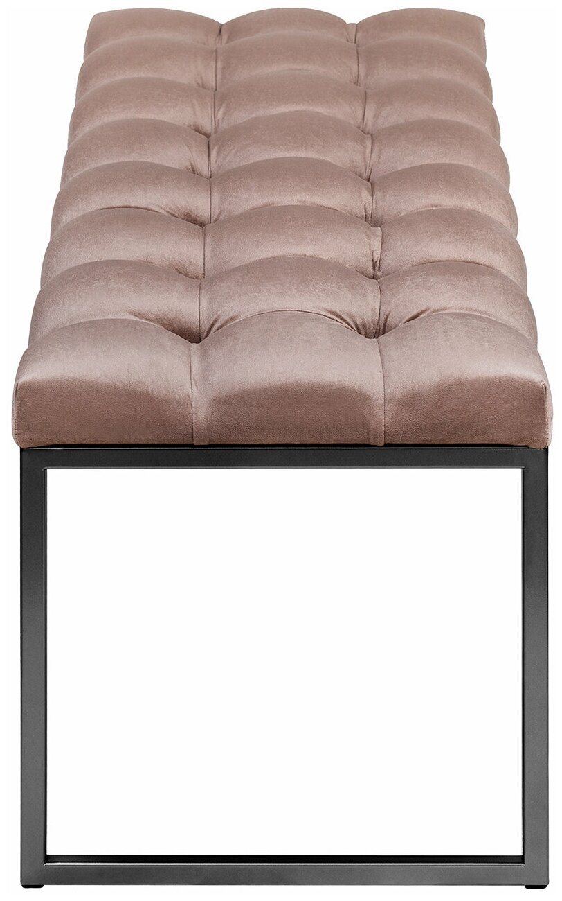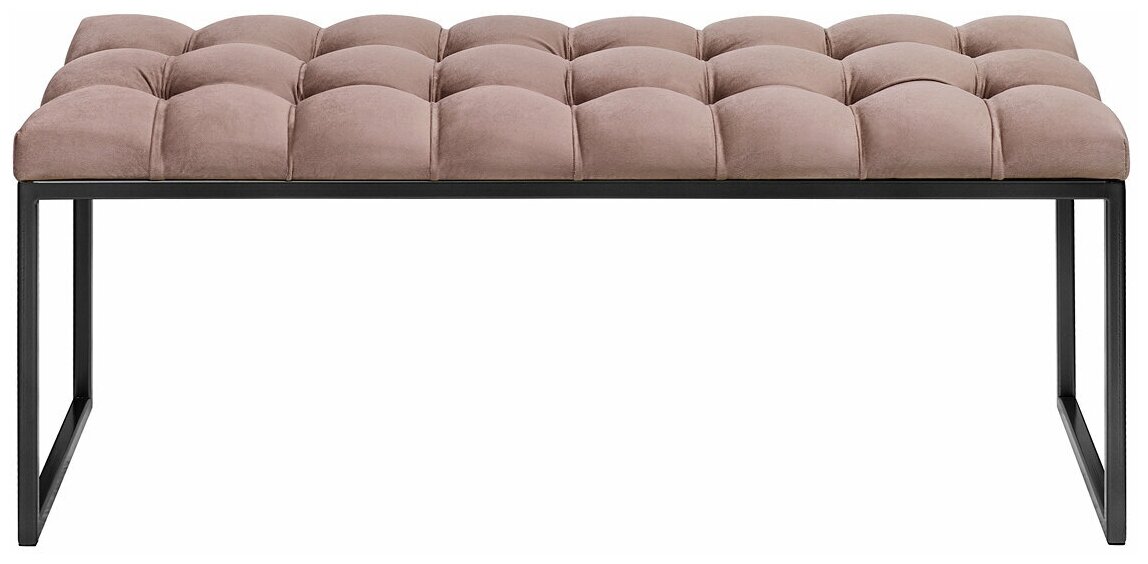 Банкетка с черным основанием и мягкой велюровой подушкой с каретной стяжкой. Характеристики банкетки :• размеры: (длина х ширина х высота) 1100 х 400 х 450 мм,• вес – 9,6 кг,• высота подушки — 80 мм,• обивка — искусственный велюр, • наполнитель — пенополиуретан,• максимальная нагрузка — 120 кг.Основание банкетки изготовлено из стали с полимерным покрытием. Собственное производство обеспечивает надежность и эстетику сварных швов металлической мебели.Банкетка с велюровой подушкой отличается элегантным видом и комфортной посадкой. Мягкая обивка с высокой износостойкостью, прошла тест Мартиндейла — 35 000 циклов.Бархатистая ткань легко чистится от загрязнений, для ухода разрешена сухая и влажная чистка. Стильная банкетка подойдет для прихожей, спальни, гостиной и кабинета.Банкетка лофт добавит изысканности интерьеру квартиры, офиса, салона и загородного дома. Банкетка отлично сочетается со стеллажами KARIN и пуфами OMEGA.Банкетку доставляем в собранном виде в надежной упаковке.