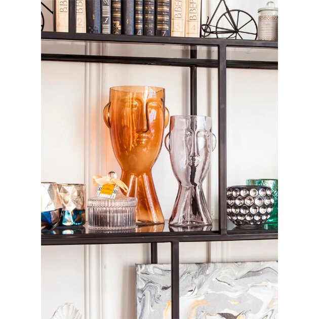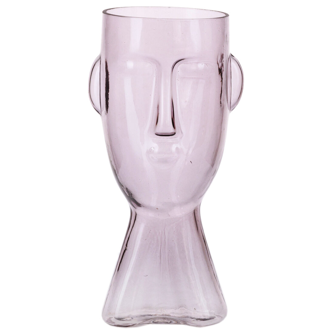 Настольная ваза – скорее арт-объект, чем чисто функциональная емкость для размещения букета. Сосуд выполнен в виде головы человека и представляет самостоятельную эстетическую ценность, даже не будучи заполненным живыми цветами или ветками. Подчеркнуть оригинальность формы можно с помощью декоративной зелени: композиция из стеблей аспарагуса, гипсофилы или папоротника будет смотреться как пышная шевелюра загадочного персонажа. Беспокоиться о сохранности стеклянного аксессуара нет причин – широкое основание делает его устойчивым на любой горизонтальной поверхности.
