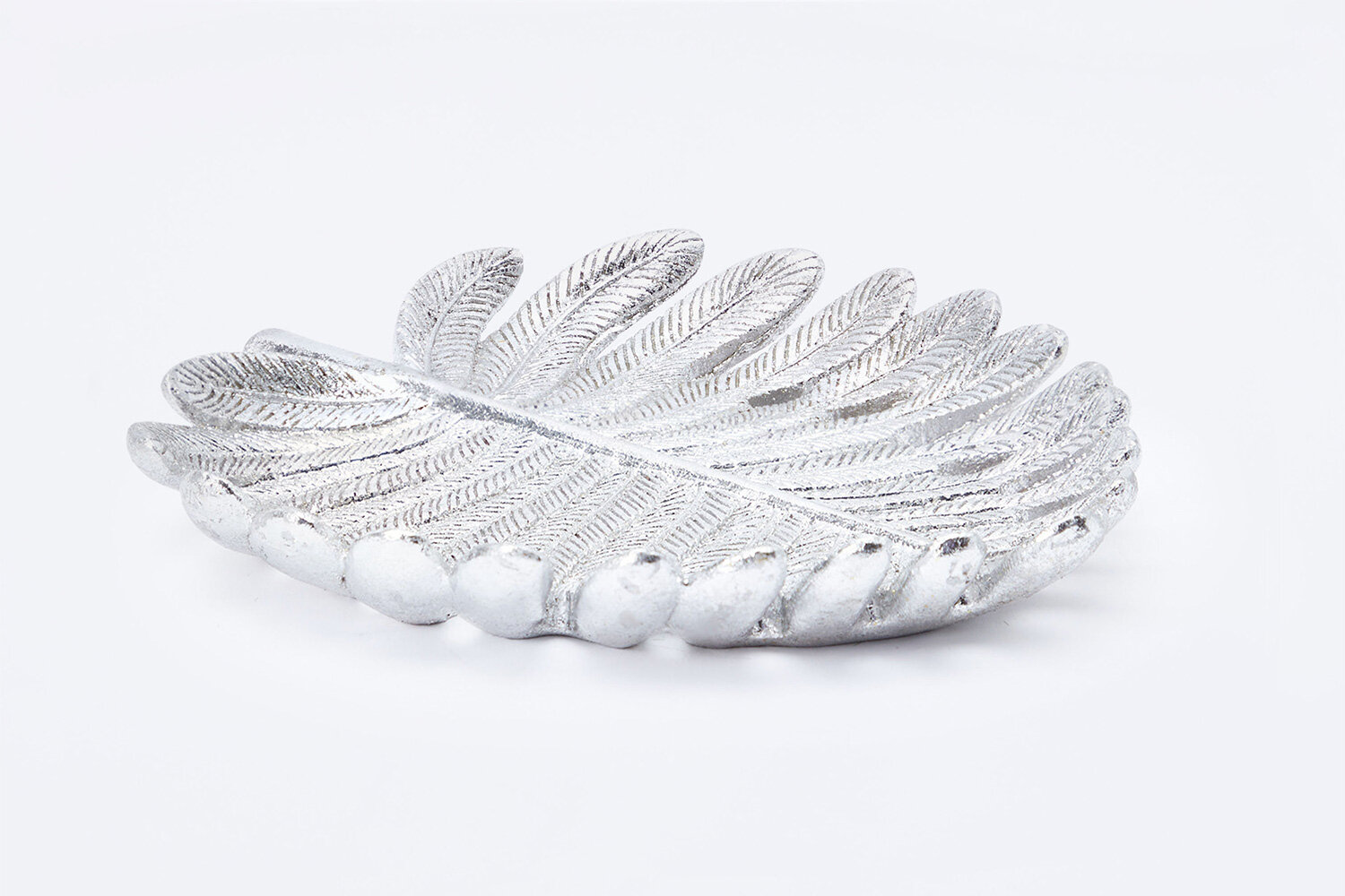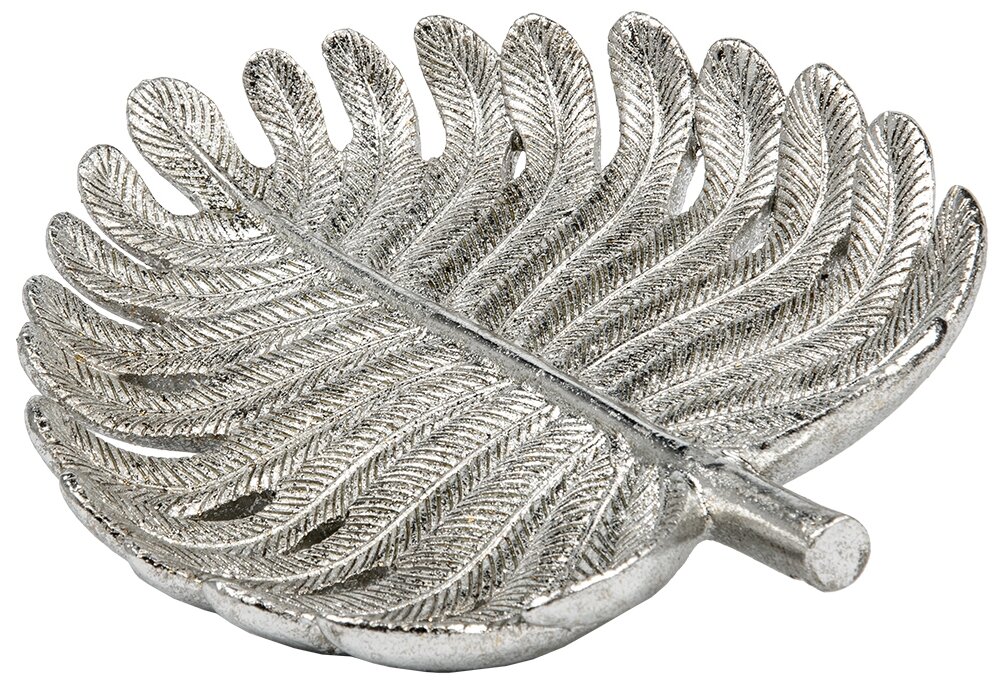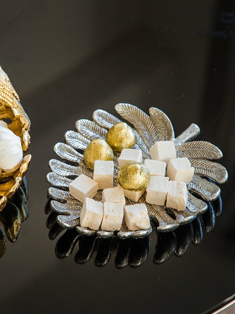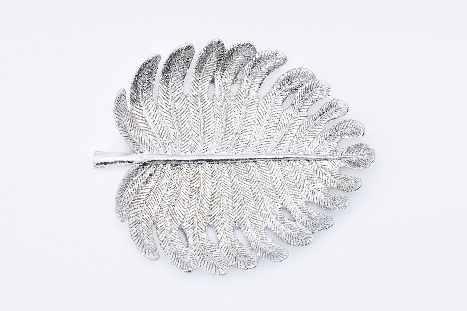 Блюдо Пальмовый лист действительно напоминает широкий лист тропического растения, покрытый слоем сверкающего драгоценного металла. Предмет посуды выполнен настолько филигранно, что на нем легко различимы прожилки и стебель — словно узоры, которые нанесла сама природа. Изысканное блюдо станет украшением праздничного стола, а кулинарные шедевры, которые вы в нем подадите, покажутся гостям еще вкуснее, ярче и ароматнее. Модель подходит для сервировки экзотических фруктов, десертов, канапе, сэндвичей и других порционных закусок. Блюдо изготовлено из прочного полимера и не один год будет радовать вас, вашу семью и гостей.