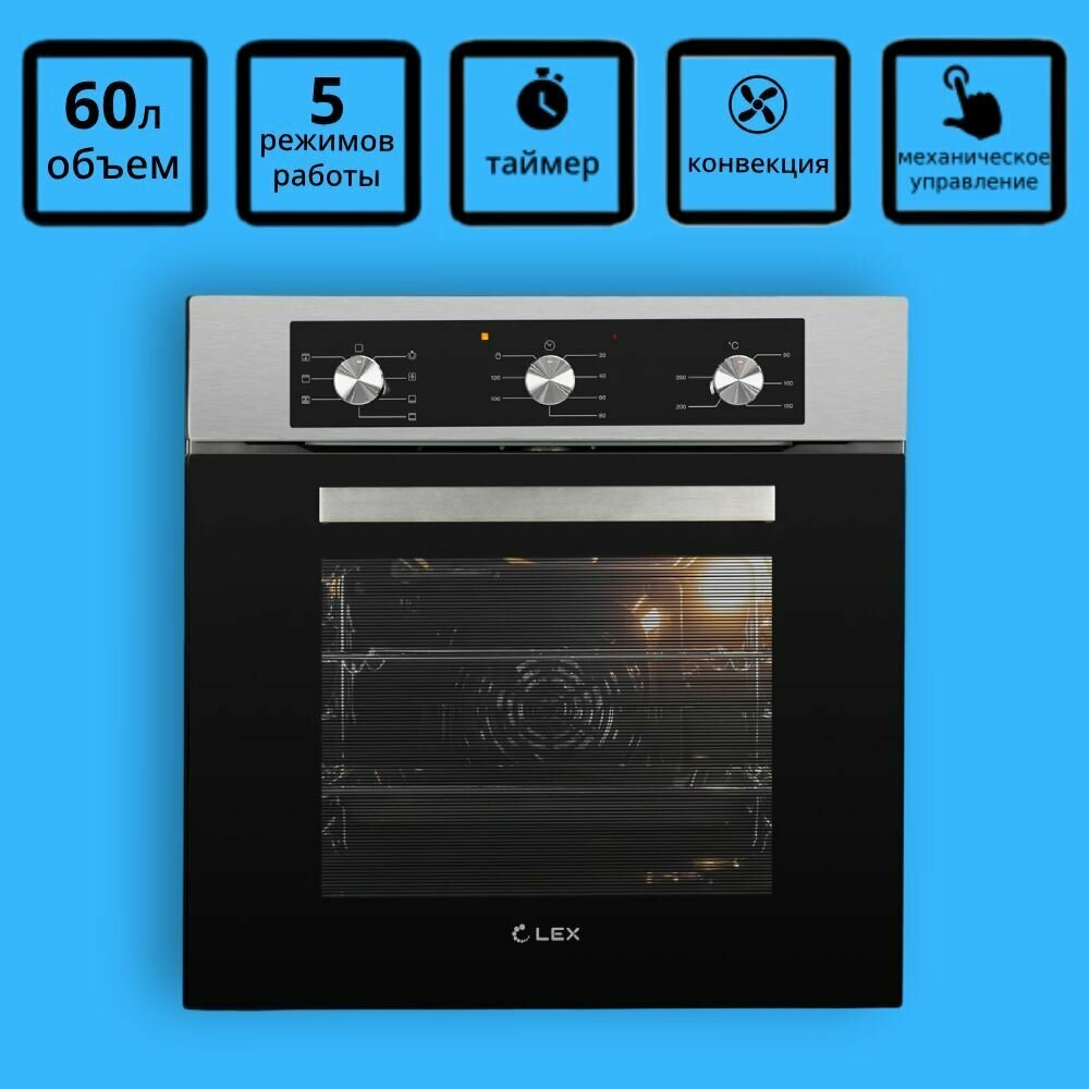 Духовой шкаф Lex EDM 073 IX нержавеющая сталь/черный, электрическая духовка, объём 60л, покрытие: эмаль легкой очистки, электрический гриль, программ духовки: 7, независимое управление, переключатели поворотные
