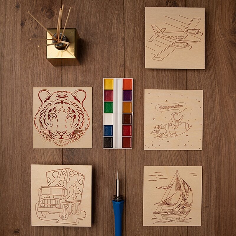 На доски нанесены разные рисунки с разным уровнем сложности. Для занятий вам понадобится прибор для выжигания, также оформить работу можно акварельными и гуашевыми красками, цветными карандашами и фломастерами.
