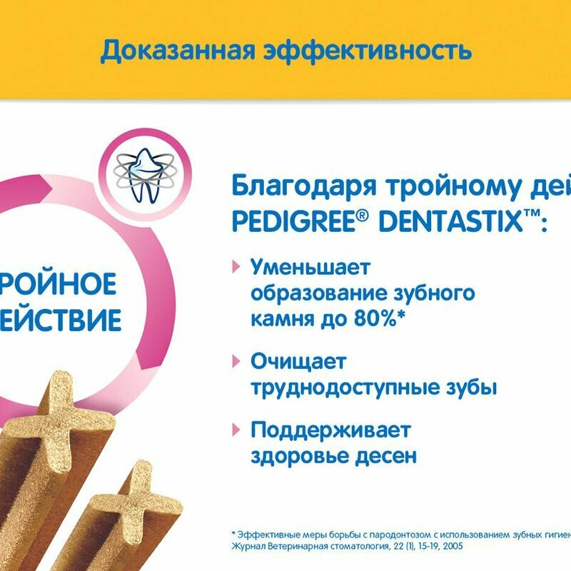 Это полезное лакомство от Pedigree заботится о состоянии полости рта вашей собаки для её долгой и здоровой жизни. X-образная форма и особая текстура Denta Stix от Pedigree помогают эффективно очищать зубы и массировать дёсны собаки, а слюна, которая выделяется при жевании, удаляет остатки пищи. Сульфат цинка, в составе Denta Stix от Pedigree, замедляет формирование зубного камня и позволяет легко удалить его во время жевания, а триполифосфат натрия не позволяет кальцию откладываться на зубах.