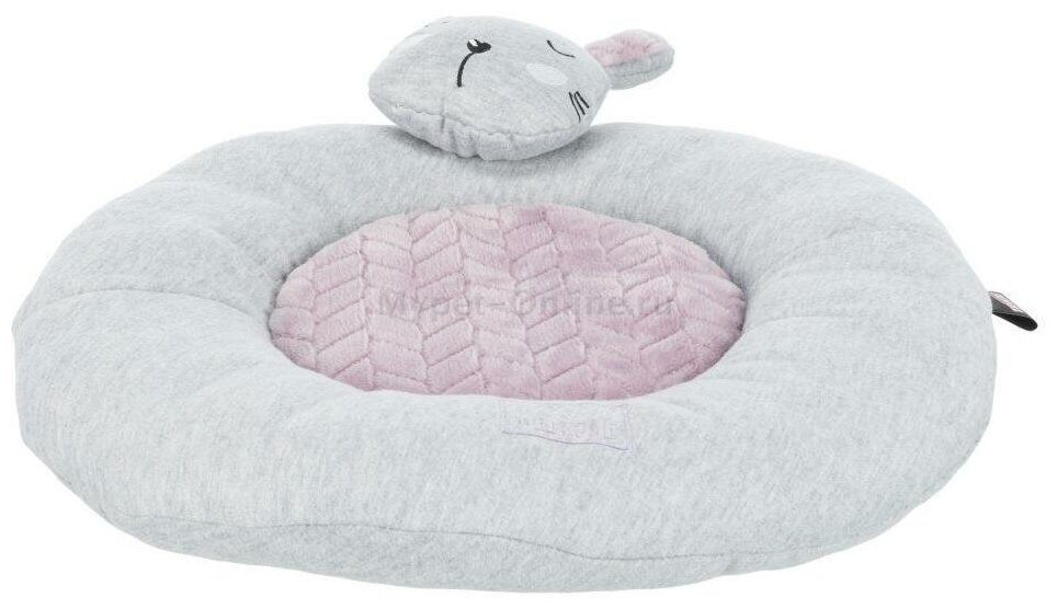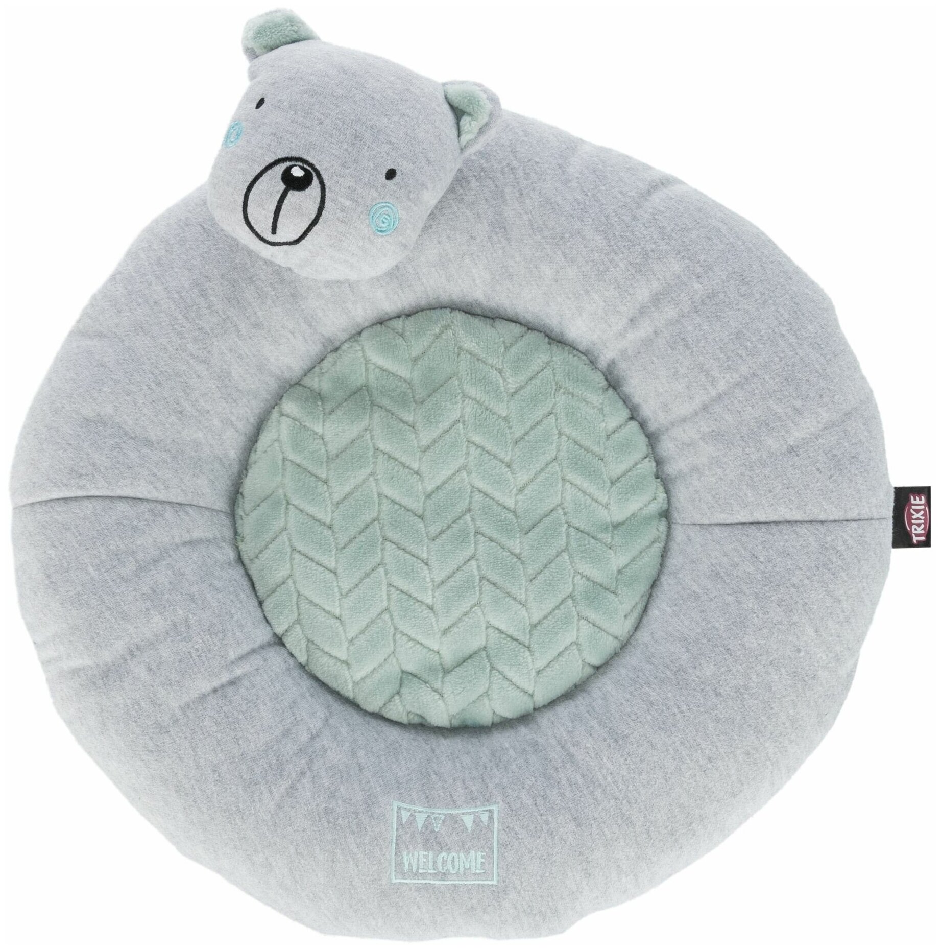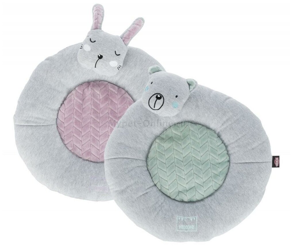 Лежак с бортиком Junior "Мишка" для щенков Бренд Trixie Модель 38253 Диаметр 40 см Обивка плюш/ткань Наполнитель флис Страна Китай Мягкий круглый лежак с невысоким ботиком для щенков. Имеет обивку из мягкой ткани и фактурного плюша с полиэфирным защитным покрытием. Лежак выполнен в красивом сочетании светло-серого и мятного цветов.Подушка несъемная и надежно закреплена. Дно лежака не скользит благодаря силиконовому напылению. К бортику лежака пришита игрушка.