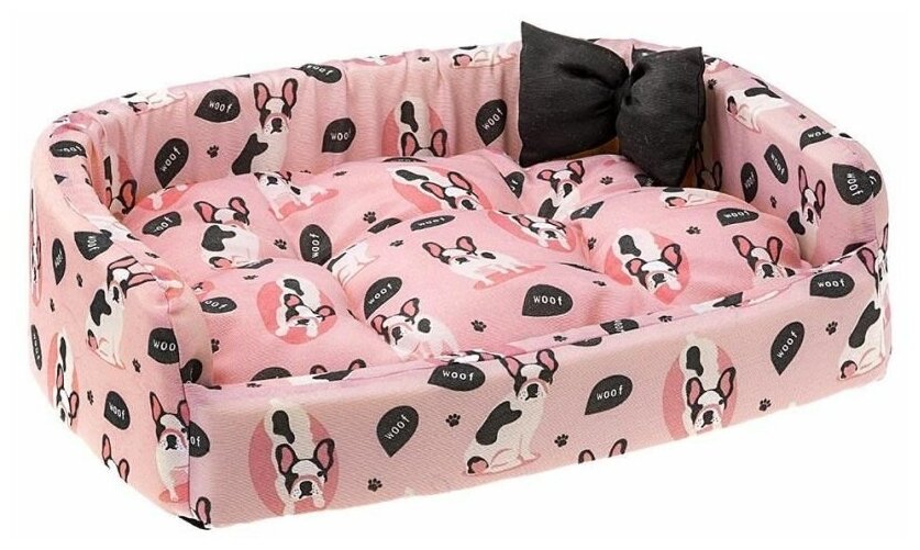 Тканевые лежанки для кошек и собак в нежно-розовом и светло-голубом вариантах-Изготовлены из хлопка, имеют форму диванчика и украшение в виде объемного банта.-В комплекте с двусторонней внутренней подушкой с одной стороны с рисунком, а с другой - однотонной.-Низкая передняя сторона для легкого доступа животного.-Прочные и удобные боковые стенки с толстой обивкой.-Полностью стирается в машине при температуре 30° C описаниеСофа Harris Woof, сделанная из мягкого хлопка с оригинальным эффектом блеска и действительно красивым рисунком со сладкими изображениями собак. Выглядит настолько красиво, что даже кошачьи друзья выберут её для своих моментов отдыха, мы уверены. Как шикарный штрих - декоративный бант! Софа Harris Woof имеет слегка округлую форму с высокими мягкими бортами и поставляется с удобной подушкой. Подушка, съемная, имеет двойную поверхность, одна сторона которой напечатана в том же узоре, что и софа, а другая-в темном однотонном цвете. Благодаря опущенному входу с передней стороны животному обеспечивается легкий доступ в лежанку.Рекомендуется для маленьких и средних животных.