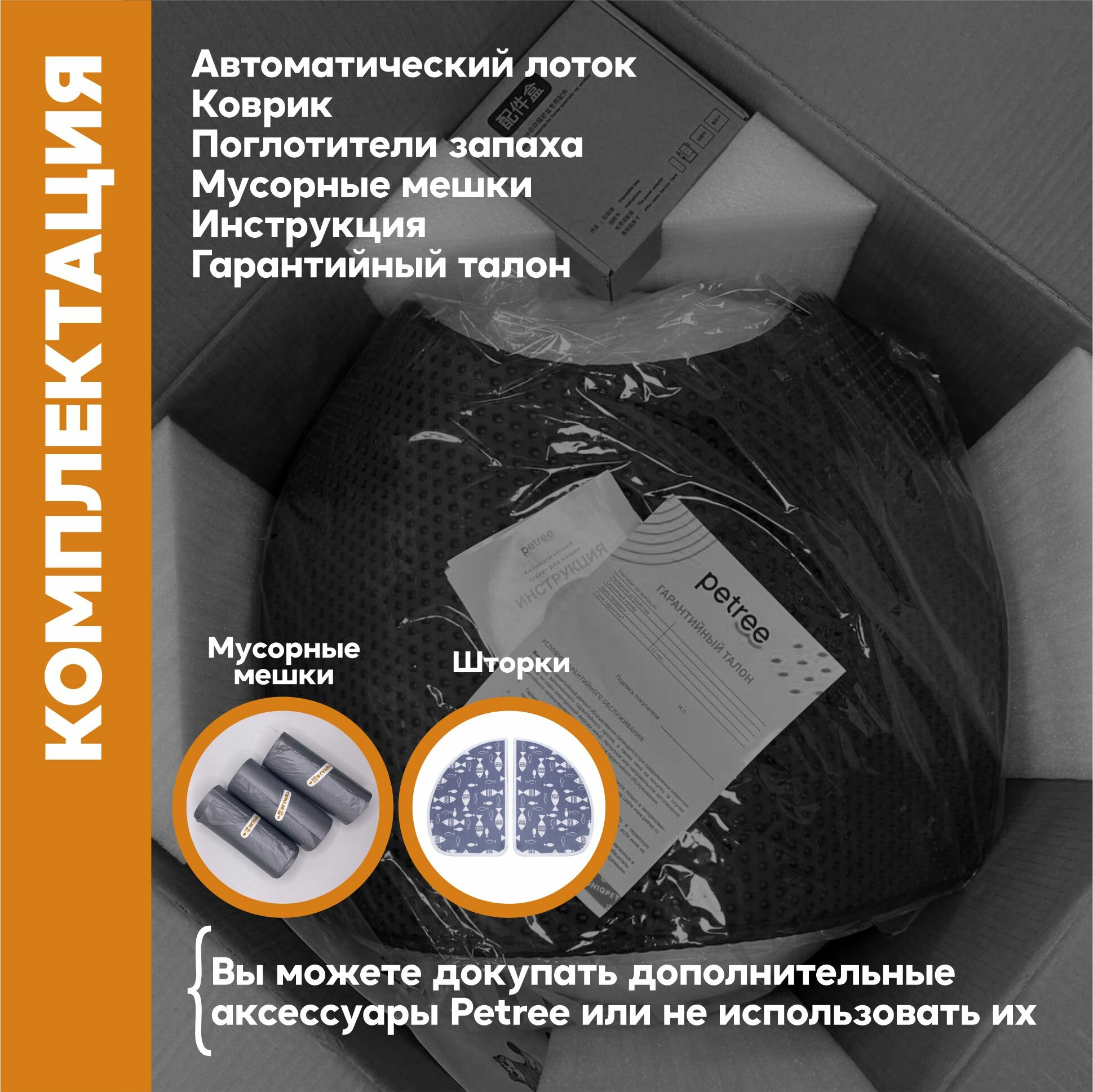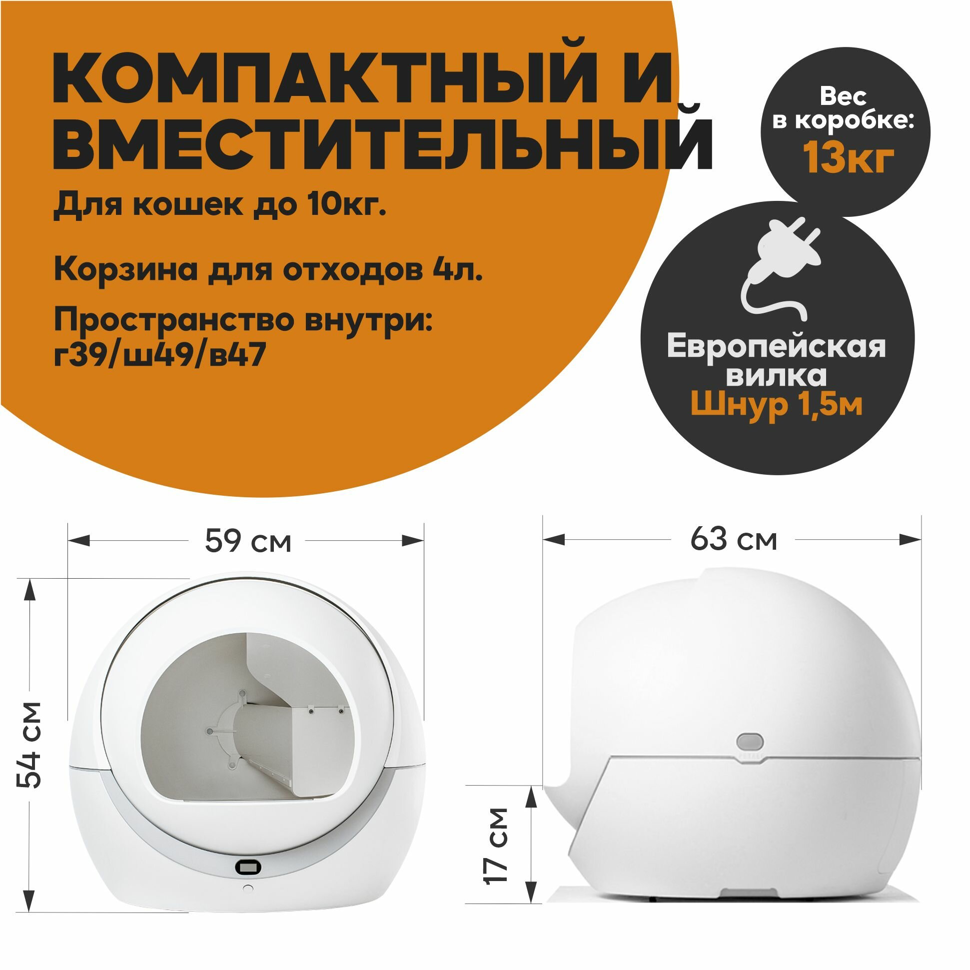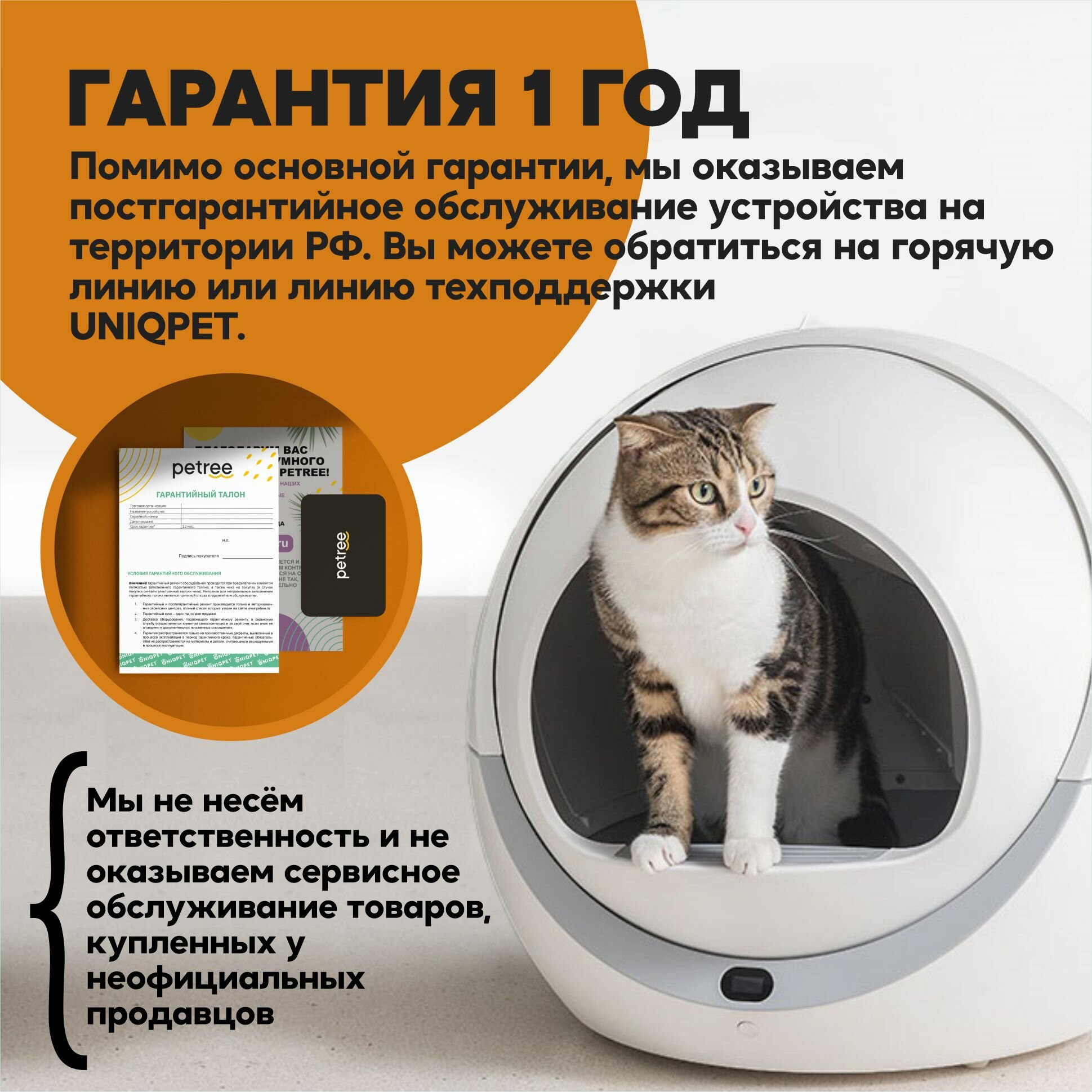 Автоматический туалет для кошек любых размеров, весом до 10 кг.Управление устройством осуществляется через WIFI приложение на русском языке.Работает через приложение Smart Life.В приложении можно:- Настроить интервал уборки после посещения питомцем (по умолчанию через 30 секунд)- Получить напоминание о заполнении корзины для отходов- Проверить прогресс использования туалета в течении дня, определить количество походов, время и вес питомцев.- Настроить спящий режим (период, когда туалет не будет включаться, после посещения питомцем)Отличительная особенность туалета - простота конструкции и использования, благодаря чему достигается абсолютная надежность устройства.Встроенный датчик веса автоматически определяет, что ваш питомец закончил свои дела, и примерно через 30 сек включает режим уборки. внимание: датчик веса не способен обнаружить животное весом менее 1,5 кг, поэтому барабан не будет автоматически вращаться после использования туалета котёнком!Контейнер для отходов 4 литра хватает в среднем на 3-4 дня (возможно приобретение увеличенного контейнера на 6 литров)Для правильной работы устройства необходимо использовать комкующийся бентонитовый( глиняный) наполнитель с гранулами до 3-4 мм в диаметре. Не подходит наполнитель большего размера.Снижает уровень неприятных запахов в квартире за счет конструкции. (Также снизить уровень неприятных запахов поможет поглотитель запахов Petree) Раз в месяц необходимо мыть барабан. Кнопка, расположенная под дисплеем, позволяет переводить устройство в спящий режим и включать режим уборки вручную.В задней части туалета есть специальные отверстия для установки ароматизаторов, которые действуют в течении 1-1,5 месяцев.Гарантийное обслуживание 12 мес. от авторизованных сервисных центров.Специальный двуслойный коврик уловитель наполнителя для туалета входит в комплект.Пожалуйста, имейте ввиду размеры туалета, при покупке.В комплекте:• Туалет – 1 шт.• Мешки мусорные - 1 рулон.• Поглотители запаха – 1 шт. • Коврик – 1 шт. • Адаптер питания евро – 1 шт.• Корзина для мусора – 1 шт. • Инструкция — 1 шт. • Гарантийный талон — 1 шт. ООО «Юникпэт» официально и эксклюзивно представляет в РФ продукцию компании Petree. Уполномочены принимать любые обращения по качеству и обслуживанию устройств.