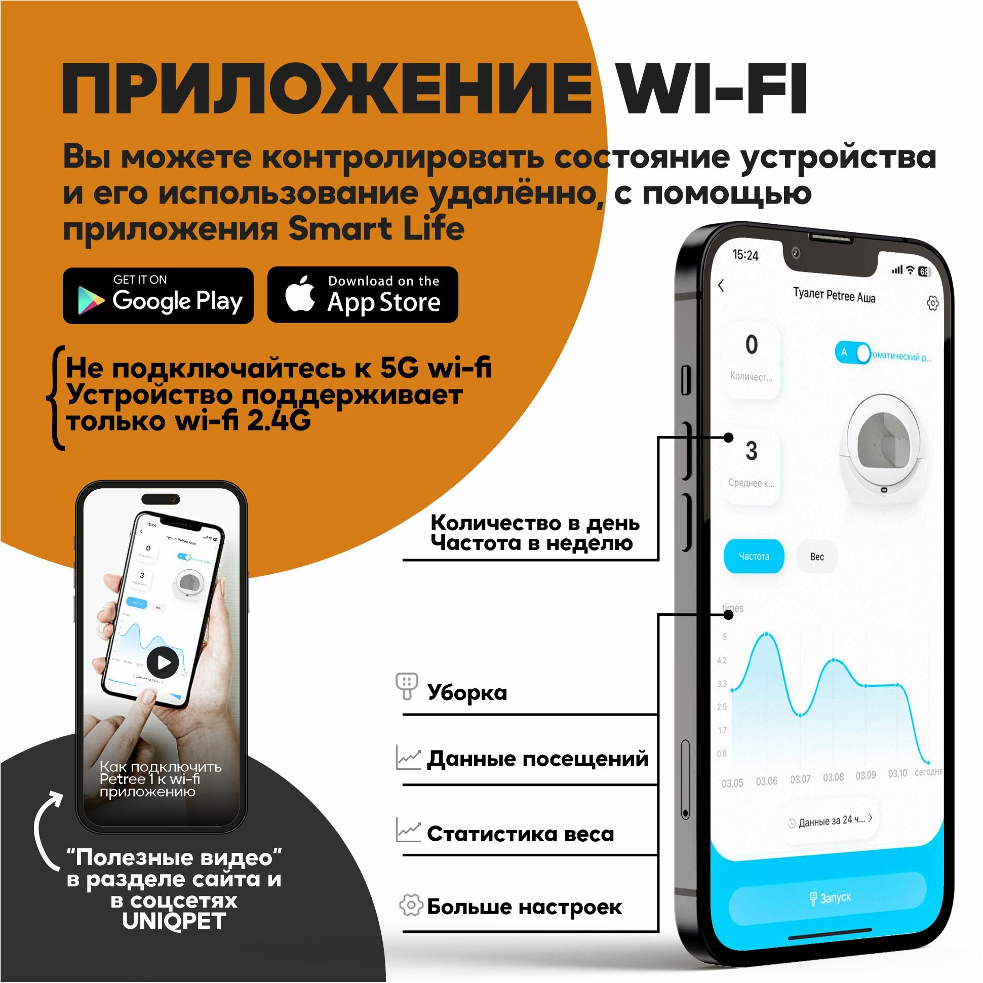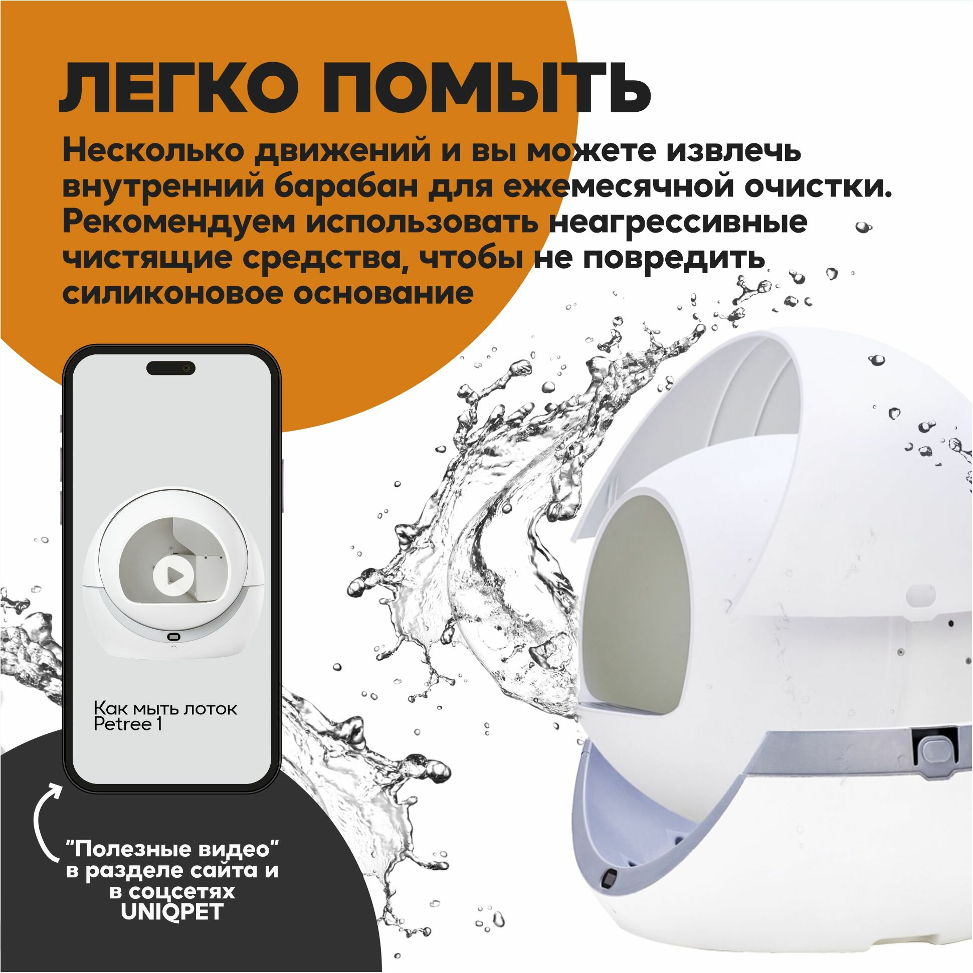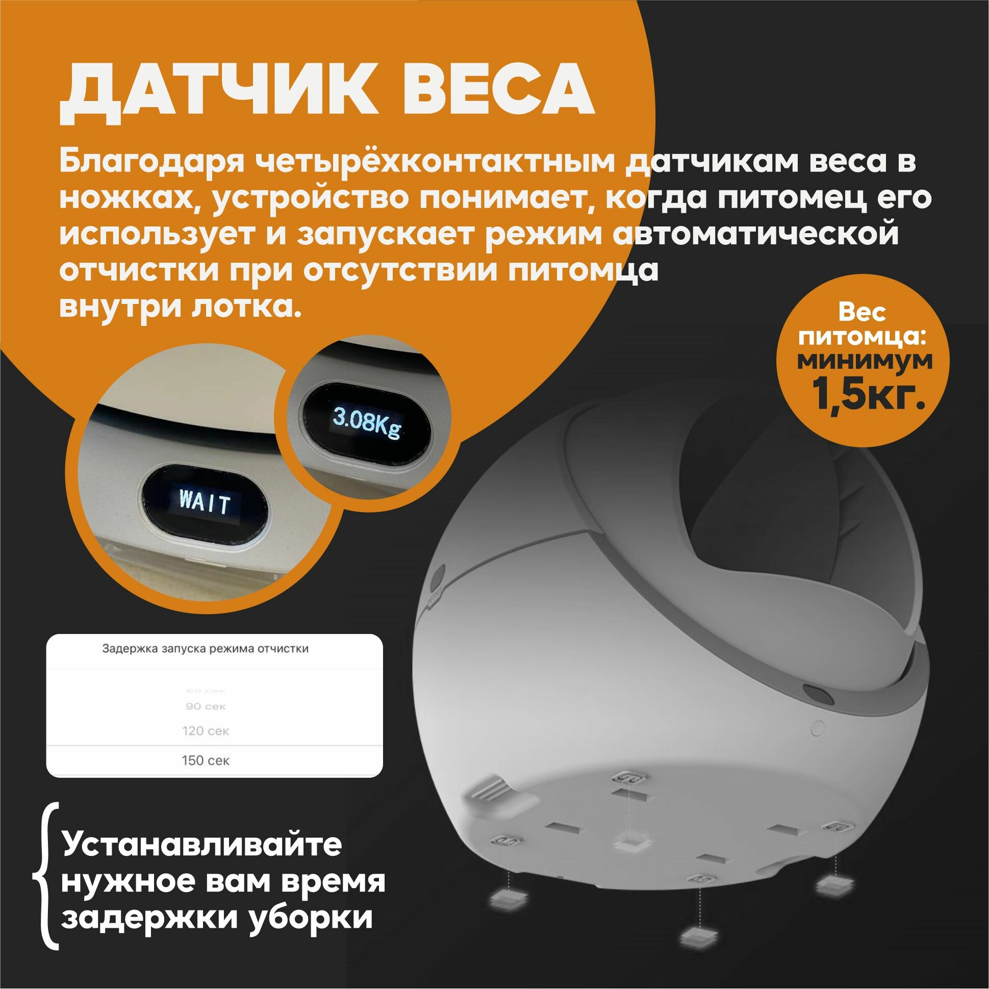 Автоматический туалет для кошек любых размеров, весом до 10 кг.Управление устройством осуществляется через WIFI приложение на русском языке.Работает через приложение Smart Life.В приложении можно:- Настроить интервал уборки после посещения питомцем (по умолчанию через 30 секунд)- Получить напоминание о заполнении корзины для отходов- Проверить прогресс использования туалета в течении дня, определить количество походов, время и вес питомцев.- Настроить спящий режим (период, когда туалет не будет включаться, после посещения питомцем)Отличительная особенность туалета - простота конструкции и использования, благодаря чему достигается абсолютная надежность устройства.Встроенный датчик веса автоматически определяет, что ваш питомец закончил свои дела, и примерно через 30 сек включает режим уборки. внимание: датчик веса не способен обнаружить животное весом менее 1,5 кг, поэтому барабан не будет автоматически вращаться после использования туалета котёнком!Контейнер для отходов 4 литра хватает в среднем на 3-4 дня (возможно приобретение увеличенного контейнера на 6 литров)Для правильной работы устройства необходимо использовать комкующийся бентонитовый( глиняный) наполнитель с гранулами до 3-4 мм в диаметре. Не подходит наполнитель большего размера.Снижает уровень неприятных запахов в квартире за счет конструкции. (Также снизить уровень неприятных запахов поможет поглотитель запахов Petree) Раз в месяц необходимо мыть барабан. Кнопка, расположенная под дисплеем, позволяет переводить устройство в спящий режим и включать режим уборки вручную.В задней части туалета есть специальные отверстия для установки ароматизаторов, которые действуют в течении 1-1,5 месяцев.Гарантийное обслуживание 12 мес. от авторизованных сервисных центров.Специальный двуслойный коврик уловитель наполнителя для туалета входит в комплект.Пожалуйста, имейте ввиду размеры туалета, при покупке.В комплекте:• Туалет – 1 шт.• Мешки мусорные - 1 рулон.• Поглотители запаха – 1 шт. • Коврик – 1 шт. • Адаптер питания евро – 1 шт.• Корзина для мусора – 1 шт. • Инструкция — 1 шт. • Гарантийный талон — 1 шт. ООО «Юникпэт» официально и эксклюзивно представляет в РФ продукцию компании Petree. Уполномочены принимать любые обращения по качеству и обслуживанию устройств.