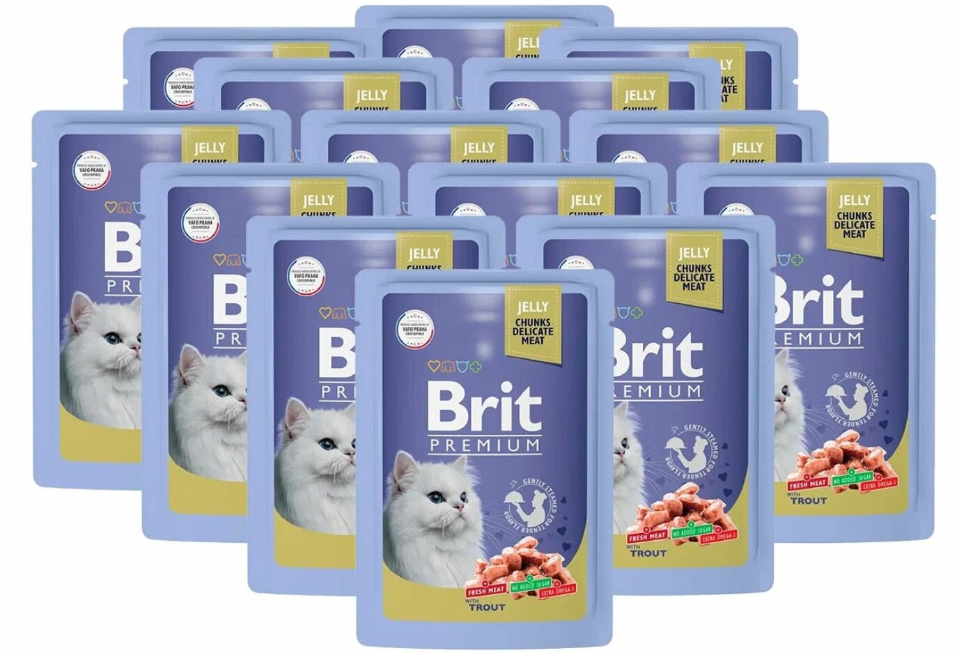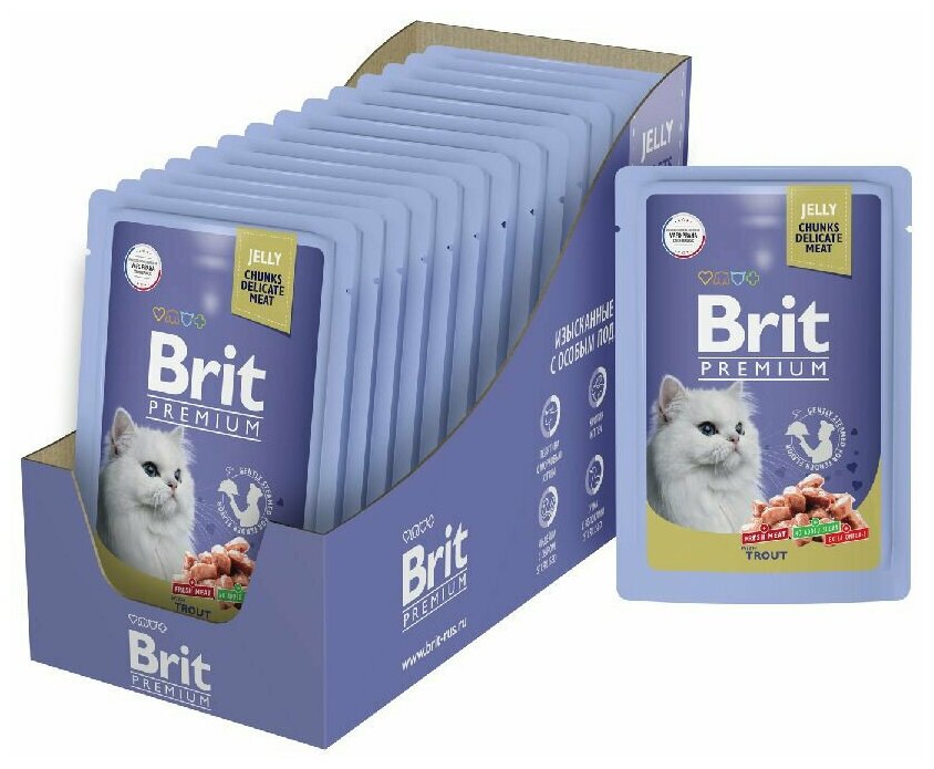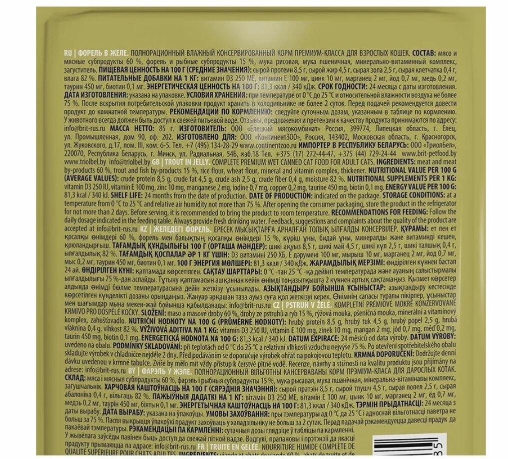 Нежные кусочки форели в аппетитном желе - идеальное сочетание для полноценного и сбалансированного рациона. Паучи Brit Premium однозначно заинтересуют вашу кошку и станут для нее любимым блюдом. Влажный корм содержит все необходимые витамины и минералы, которые необходимы питомцу. Таурин в составе – важный ингредиенты для поддержания остроты зрения и здоровья сердечно-сосудистой системы кошек.Паучи отлично дополнят полнорационный сухой корм Brit Premium и внесут разнообразие в питание Вашей кошки.состав: мясо и мясные субпродукты 60 %, форель и рыбные субпродукты 15 %, мука рисовая, мука пшеничная, минерально-витаминный комплекс, загуститель.пищевая ценность на 100 Г (средние значения): сырой протеин 8,5 г, сырой жир 4,5 г, сырая зола 2,5 г, сырая клетчатка 0,4 г, влага 82 %.питательные добавки на 1 КГ: витамин D3 250 МЕ, витамин Е 100 мг, цинк 10 мг, марганец 2 мг, йод 0,7 мг, медь 0,2 мг, таурин 450 мг, биотин 0,1 мг.энергетическая ценность на 100 Г: 81,3 ккал / 340 кДж. Срок годности: 24 месяца с даты изготовления.дата изготовления: указана на упаковке.условия хранения: при температуре от 0 °С до 25 °С и относительной влажности воздуха не более 2 суток. Перед подачей рекомендуется довести продукт до комнатной температуры. Рекомендации ПО кормлению: следуйте суточным дозам, указанным в таблице по кормлению. У животного всегда должен быть доступ к свежей питьевой воде.