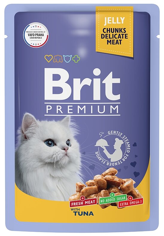 Полнорационный влажный корм премиум класса для взрослых кошек Brit Premium тунец в желе. Нежные кусочки тунца в аппетитном желе - идеальное сочетание для полноценного и сбалансированного рациона. Паучи Brit Premium однозначно заинтересуют вашу кошку и станут для нее любимым блюдом. Влажный корм содержит все необходимые витамины и минералы, которые необходимы питомцу. Таурин в составе важный ингредиенты для поддержания остроты зрения и здоровья сердечно-сосудистой системы кошек. Паучи отлично дополнят полнорационный сухой корм Brit Premium и внесут разнообразие в питание Вашей кошки. состав: мясо и мясные субпродукты 60 %, тунец и рыбные субпродукты 15 %, мука рисовая, мука пшеничная, минерально-витаминный комплекс, загуститель. пищевая ценность на 100 Г (средние значения): сырой протеин 8,5 г, сырой жир 4,5 г, сырая зола 2,5 г, сырая клетчатка 0,4 г, влага 82 %. питательные добавки на 1 КГ: витамин D3 250 МЕ, витамин Е 100 мг, цинк 10 мг, марганец 2 мг, йод 0,7 мг, медь 0,2 мг, таурин 450 мг, биотин 0,1 мг. энергетическая ценность на 100 Г:81,3 ккал / 340 кДж. условия хранения: при температуре от 0 С до 25 С и относительной влажности воздуха не более 75 %. После вскрытия потребительской упаковки продукт хранить в холодильнике не более 2 суток. Перед подачей рекомендуется довести продукт докомнатной температуры. рекомендации ПО кормлению: следуйте суточным дозам, указанным в таблице по кормлению. У животного всегда должен быть доступ к свежей питьевой воде.