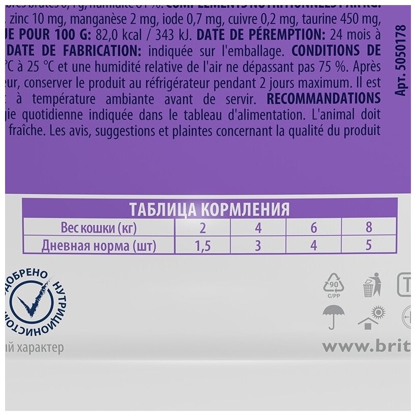 Нежные кусочки трески в аппетитном желе - идеальное сочетание для полноценного и сбалансированного рациона. Паучи Brit Premium однозначно заинтересуют вашу кошку и станут для нее любимым блюдом. Влажный корм содержит все необходимые витамины и минералы, которые необходимы питомцу. Таурин в составе – важный ингредиенты для поддержания остроты зрения и здоровья сердечно-сосудистой системы кошек.Паучи отлично дополнят полнорационный сухой корм Brit Premium и внесут разнообразие в питание Вашей кошки.состав: мясо и мясные субпродукты 60 %, треска и рыбные субпродукты 15 %, мука рисовая, мука пшеничная, минерально-витаминный комплекс, загуститель.пищевая ценность на 100 Г (средние значения): сырой протеин 9,5 г, сырой жир 5 г, сырая зола 2,5 г, сырая клетчатка 0,4 г, влага 81 %.питательные добавки на 1 КГ: витамин D3 250 МЕ, витамин Е 100 мг, цинк 10 мг, марганец 2 мг, йод 0,7 мг, медь 0,2 мг, таурин 450 мг, биотин 0,1 мг.энергетическая ценность на 100 Г: 82,0 ккал / 343 кДж.срок годности: 24 месяца с даты изготовления.дата изготовления: указана на упаковке.условия хранения: при температуре от 0 °С до 25 °С и относительной влажности воздуха не более 75 %. После вскрытия потребительской упаковки продукт хранить в холодильнике не более 2 суток. Перед подачей рекомендуется довести продукт до комнатной температуры.рекомендации ПО кормлению: следуйте суточным дозам, указанным в таблице по кормлению. У животного всегда должен быть доступ к свежей питьевой воде.