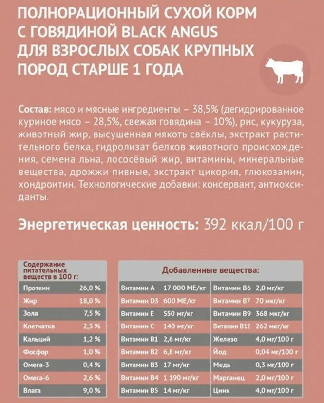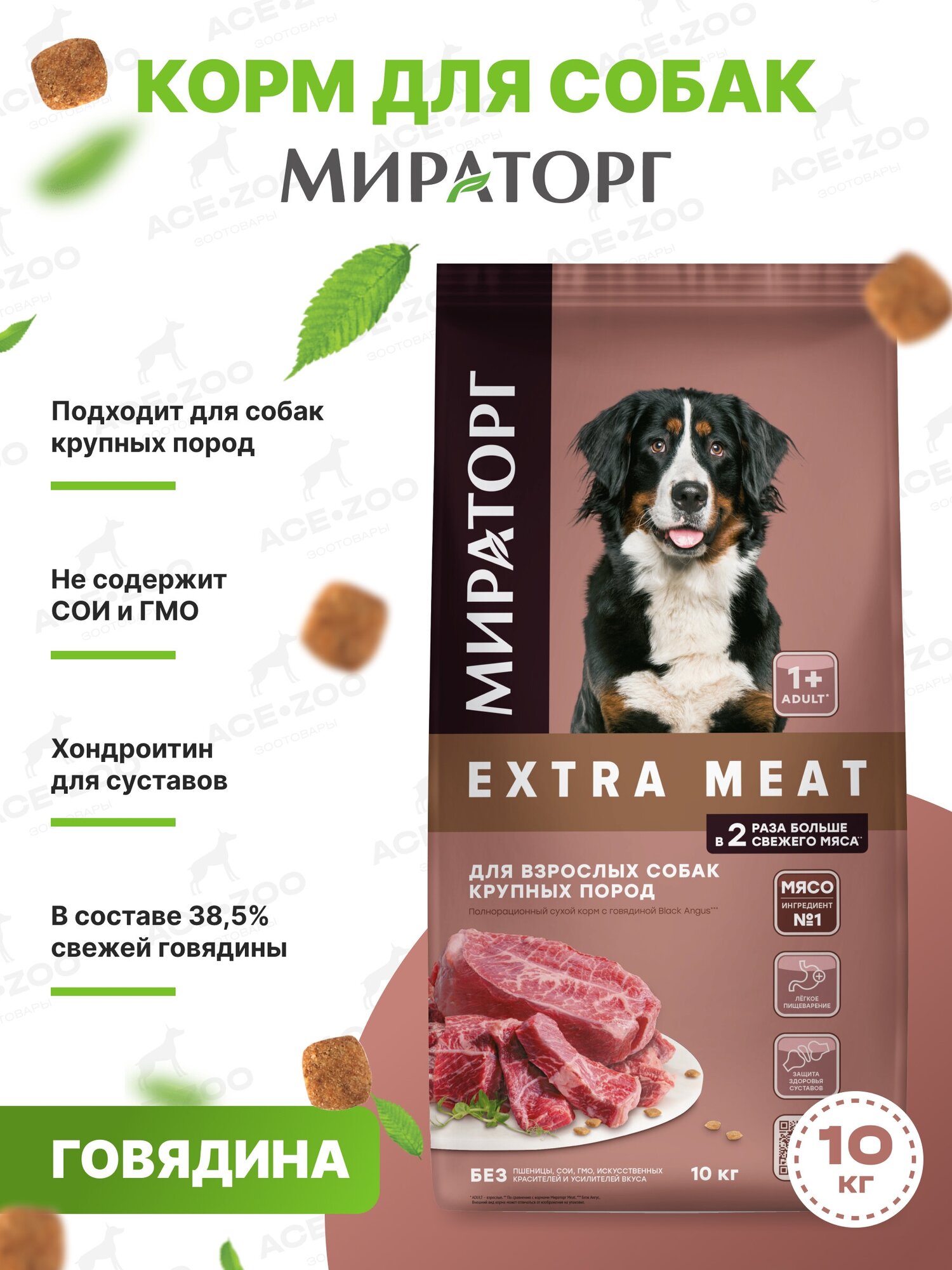 Сухой корм Мираторг EXTRA MEAT — корм премиум класса со свежей говядиной и телятиной собственного производства, создан для питомцев, привередливых в выборе питания, а также имеющих чувствительное пищеварение. Диетическая телятина и легко усвояемая говядина дополняют корм полноценным белком животного происхождения для особой пользы и изысканного вкуса. Крупные породы собак подвержены проблемам с опорно-двигательным аппаратом и сердечно-сосудистой системой. Чтобы ваш питомец оставался здоровым и активным, выбирайте корм EXTRA MEAT с высоким содержанием мяса и специальными минеральными комплексами, которые укрепляют хрящевую ткань и суставы. Цикорий укрепляет иммунитет, мякоть свеклы улучшает пищеварение, а семена льна и рыбий жир способствуют здоровью кожи и шерсти. Оригинальный комплекс глюкозамин/хондроитин поддержит суставы питомца на протяжении всей его жизни.Состав: Мясо и мясные ингредиенты – 38,5% (дегидрированное куриное мясо – 28,5%, свежая говядина - 10%), рис, кукуруза, животный жир, высушенная мякоть свёклы, экстракт растительного белка, гидролизат белков животного происхождения, семена льна, лососёвый жир, витамины, минеральные вещества, дрожжи пивные, экстракт цикория, глюкозамин, хондроитин.