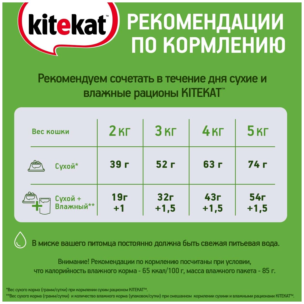 Сухой корм с идеально сбалансированным содержанием белков, минеральных веществ и витаминов. Содержит: Белки - для поддержания мышечного тонуса, силы и активности; Минералы - для крепости костей и зубов; Масло - для здоровой кожи и блестящей шерсти; Таурин - для остроты зрения и стабильной работы сердца; Витамины - для укрепления иммунной системы организма, улучшения процесса обмена веществ. Кажется, пора подкрепиться чем-нибудь вкусненьким! Чтобы целый день исследовать все новое и интересное в доме! Kitekat® – это полноценная еда, которая содержит все необходимое для вашей кошки. Kitekat приготовлен из таких же качественных продуктов, что вы используете дома для своих близких: мясных ингредиентов, овощей, растительного масла и круп. Kitekat знает, как их правильно сбалансировать для поддержания энергии и здоровья вашего кота.В миску следует насыпать сразу всю дневную норму, поскольку кошка сама знает, когда и сколько ей есть. Как правило, кошки едят 2-3 раза в день, а беременные и кормящие - 3-4 раза. Рядом с едой всегда должна стоять миска с чистой водой. Следите за тем, чтобы еда всегда была свежей и не залеживалась в миске по несколько дней. Рекомендуемая дневная норма потребления: Кошки 2 кг – 39 г; Кошки 3 кг – 52 г; Кошки 4 кг – 63 г; Кошки 5 кг – 74 г.Состав: злаки и продукты их переработки, мука животного происхождения (в том числе мука из птицы и говяжья), продукты животного происхождения, жир животный, белковые растительные экстракты, овощи и продукты их переработки, масло подсолнечное, минеральные вещества, таурин, холин хлорид, витамины, метионин.Содержание питательных веществ (100 г): белок – 28 г; жир – 10 г; клетчатка – 5 г; зола – 9 г; кальций – 1,5 г; фосфор – 0,9 г; витамин А – 1200 МЕ; витамин Д – 120 ME; витамин Е – 5,5 мг. Энергетическая ценность (100 г): 340 ккал / 1422 кДжХранить при температуре от +4 до +35°С и относительной влажности воздуха не более 75 .