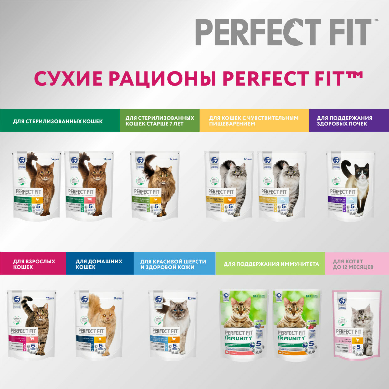 В рационе Perfect Fit Sterile учтены потребности организма кошки, прошедшей стерилизацию. Витамины группы B и железо помогут питомцу оставаться активным, пребиотики поддержат работу пищеварительной системы, а специальный адаптированный нутриентный профиль поможет животному поддерживать оптимальный вес. Баланс минералов способствует снижению риска формирования камней и поддержанию здоровья мочевыводящей системы. Специальная рецептура с пониженным содержанием жира позволяет снизить потребление калорий при каждом кормлении. Система профессионального питания, которая создана специально для поддержания здоровья кошек, чтобы они оставались активными, игривыми и получали максимум от каждого дня на протяжении всей жизни. Благодаря специальной формуле «5 слагаемых здоровья» Perfect Fit заботится о важнейших составляющих хорошего самочувствия кошки и помогает ей всегда быть полной жизненных сил.