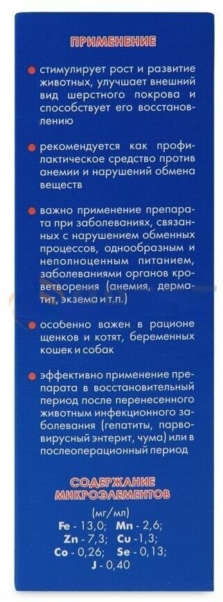 - Применение добавки улучшает рост и развитие молодняка, способствует лучшей сохранности поголовья, улучшает состояние шерстного покрова кошек, собак и пушных зверей.