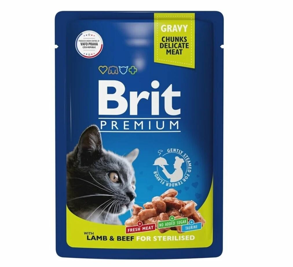 Нежные кусочки в ароматном соусе - идеальное сочетание для полноценного и сбалансированного рациона. Паучи Brit Premium однозначно заинтересуют вашу кошку и станут для нее любимым блюдом. Влажный корм содержит все необходимые витамины и минералы, которые необходимы стерилизованному питомцу. Таурин в составе – важный ингредиенты для поддержания остроты зрения и здоровья сердечно-сосудистой системы кошек.Паучи отлично дополнят полнорационный сухой корм Brit Premium и внесут разнообразие в питание Вашей кошки.состав: мясо и мясные субпродукты 75 % (в том числе ягненок 5 %, говядина 5 %), мука рисовая, мука пшеничная, минерально-витаминный комплекс, загуститель.Пищевая ценность на 100 г (средние значения): сырой протеин 9,2 г, сырой жир 4,5 г, сырая зола 2,5 г, сырая клетчатка 0,4 г, влага 82 %.Питательные добавки на 1 кг: витамин D3 250 МЕ, витамин Е 100 мг, цинк 10 мг, марганец 2 мг, йод 0,7 мг, медь 0,2 мг, таурин 450 мг, биотин 0,1 мг.Энергетическая ценность на 100 г: 82,1 ккал / 344 кДж.срок годности: 24 месяца с даты изготовления.дата изготовления: указана на упаковке.условия хранения: при температуре от 0 °С до 25 °С и относительной влажности воздуха не более 75 %. После вскрытия потребительской упаковки продукт хранить в холодильнике не более 2 суток. Перед подачей рекомендуется довести продукт до комнатной температуры. Рекомендации ПО кормлению: следуйте суточным дозам, указанным в таблице по кормлению. У животного всегда должен быть доступ к свежей питьевой воде.