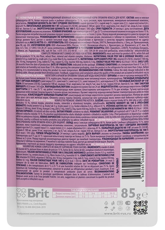 Полнорационный влажный корм премиум-класса для котят белая рыба в соусе Нежные кусочки в ароматном соусе - идеальное сочетание для полноценного и сбалансированного рациона. Паучи Brit Premium однозначно заинтересуют вашу кошку и станут для нее любимым блюдом. Влажный корм содержит все необходимые витамины и минералы, которые необходимы стерилизованному питомцу. Таурин в составе важный ингредиенты для поддержания остроты зрения и здоровья сердечно-сосудистой системы кошек. Паучи отлично дополнят полнорационный сухой корм Brit Premium и внесут разнообразие в питание Вашей кошки. состав: мясо и мясные субпродукты 60 %, белая морская рыба и рыбные субпродукты 15 %, мука рисовая, мука пшеничная, минерально-витаминный комплекс, загуститель. Пищевая ценность на 100 г (средние значения): сырой протеин 9,5 г, сырой жир 5 г, сырая зола 2,5 г, сырая клетчатка 0,4 г, влага 81 %. Питательные добавки на 1 кг: витамин D3 250 МЕ, витамин Е 100 мг, цинк 10 мг, марганец 2 мг, йод 0,7 мг, медь 0,2 мг, таурин 450 мг, биотин 0,1 мг. Энергетическая ценность на 100 г: 82,0 ккал /343 кДж. срок годности: 24 месяца с даты изготовления. дата изготовления: указана на упаковке. условия хранения: при температуре от 0 С до 25 С и относительной влажности воздуха не более 75 %. После вскрытия потребительской упаковки продукт хранить в холодильнике не более 2 суток. Перед подачей рекомендуется довести продукт до комнатной температуры. Рекомендации ПО кормлению: следуйте суточным дозам, указанным в таблице по кормлению. У животного всегда должен быть доступ к свежей питьевой воде. масса нетто: 85 г.