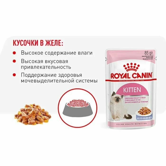 Кусочки в желе ROYAL CANIN® Kitten удовлетворят даже самых привередливых котят. Этот влажный продукт обеспечивает котенку положительные ощущения во время кормления, поддерживает здоровый водный баланс в организме и отлично сочетается с гранулами сухого корма ROYAL CANIN® Kitten при смешанном кормлении.