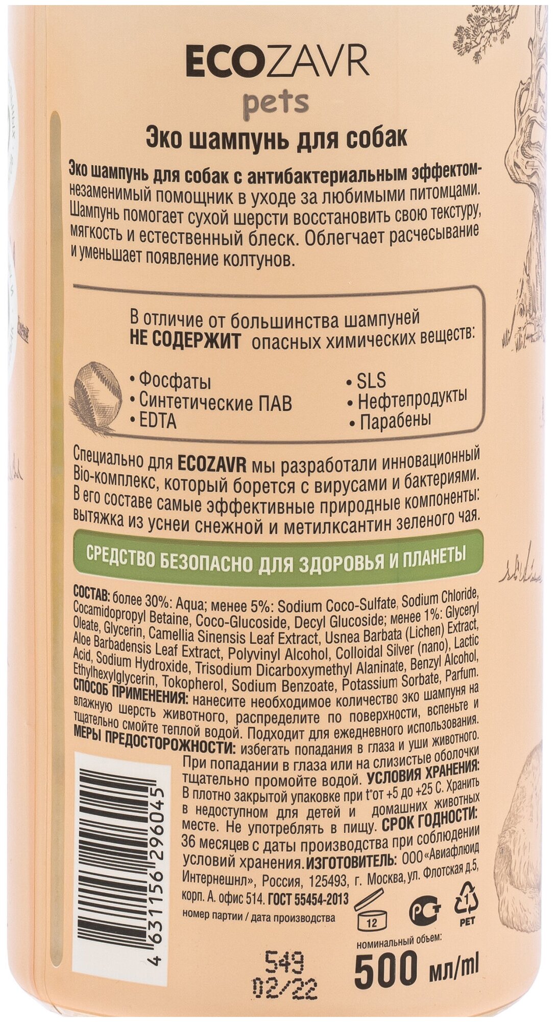 Эко-шампунь для собак ECOZAVR с антибактериальным эффектом «Алоэ», 500 мл. Фито-антибактериальный комплекс в каждом продукте. Растительные ПАВы. Уникальный компонент в составе- Plantacare. Создан с любовью и заботой о животных. Улучшенная текстура- густая кремовая пена, не сушит кожу и шерсть. Тара разработана в соответствии с евро-стандартами вторичной переработки. Не содержит аллергены. 100% смываемость.Нанесите необходимое количество эко шампуня на влажную шерсть животного, распределите по поверхности, вспеньте и тщательно смойте теплой водой. Подходит для ежедневного использования. избегать попадания в глаза и уши животного- при попадании в глаза или на слизистые оболочки тщательно промойте водой.Состав: более 30%: Aqua; менее 5%: Sodium Сoco-Sulfate, Sodium Chloride, Cocamidopropyl Betaine, Coco-Glucoside, Decyl Glucoside; менее 1%: Glyceryl Oleate, Glycerin, Camellia Sinensis Leaf Extract, Usnea Barbata (Lichen) Extract, Calendula Officinalis Flower Extract, Polyvinyl Аlcohol, Colloidal Silver (nano), Lactic Acid, Sodium Hydroxide, Trisodium Dicarboxymethyl Alaninate, Benzyl Alcohol, Ethylhexylglycerin, Tokopherol, Sodium Benzoate, Potassium Sorbate, Parfum.