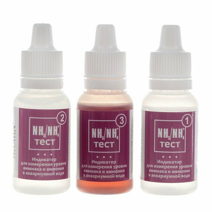 В результате жизнедеятельности рыб, разложения остатков корма, растений и экскрементов, в воде образуется аммиак (NH3). Аммиак хорошо растворяется в воде и в высоких концентрациях токсичен. Он делает невозможным процесс дыхания. Рыбы ощущают концентрацию аммиака в воде 0.2 мг/л, а концентрация 1 мг/л для большинства аквариумных рыб уже смертельна. Аммиак, взаимодействуя с молекулами воды, образует ион аммония (NH4+), который менее токсичен, но, тем не менее, также опасен для рыб и растений. Необходимо учитывать, что концентрация аммиака и ионов аммония в воде зависит от кислотности воды. В кислой воде аммиак практически отсутствует. В нейтральной и слабощелочной воде аммиак имеется, а в щелочной воде его концентрация может значительно возрастать. Поэтому особые неприятности аммиак доставляет аквариумистам, вынужденным использовать в своей практике щелочную водопроводную воду. В этом случае для предотвращения отравления рыб аммиаком и ионами аммония рекомендуется содержать аквариум в чистоте, своевременно убирать остатки корма, экскременты рыб, отмирающие растения, а также использовать фильтры с различными наполнителями. Кроме того, можно обезвреживать уже накопившийся аммиак с помощью препарата «НИЛПА® Анти аммиак». Индикатор представляет собой 3 флакона с бесцветными и коричнево-розовым растворами, не содержащими посторонних включений.