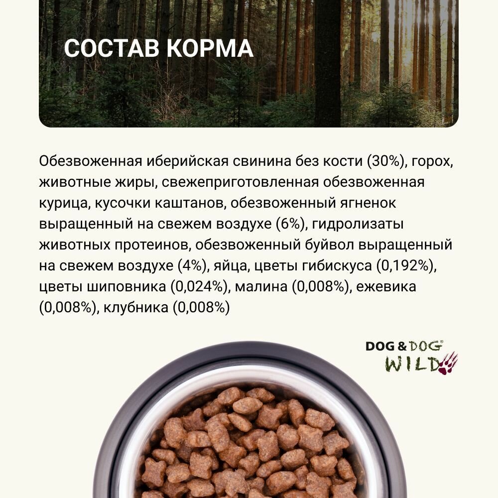 Dog & Dog WILD – линейка кормов, разработанная с учетом потребностей собак, заложенных природой. Через формулу 70%/30%/0%* корм предлагает такое же богатство и разнообразие мяса и рыбы, которые ежедневно дает природа, а также овощи, растения, ягоды и фрукты, за исключением таких компонентов, как злаки и растительные белки, которые не входят в естественный рацион собак.*70% – ингредиенты животного происхождения; 30% – растения, фрукты, овощи; 0% – злаки, картофель, тапиокаПреимущества:подходит для взрослых собак всех пород;70% ингредиентов животного происхождения;30% ингредиентов растительного происхождения;низкий гликемический индекс;без злаков;без отдушек;без ГМО;без консервантов и красителей.