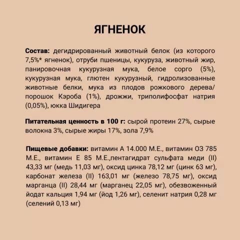 В составе высокое содержание качественного животного белка, белое сорго – альтернативный злак с самым низким гликемическим индексом, а также порошок Кэроба, богатый натуральными пищевыми волокнами, важными для микрофлоры кишечника.