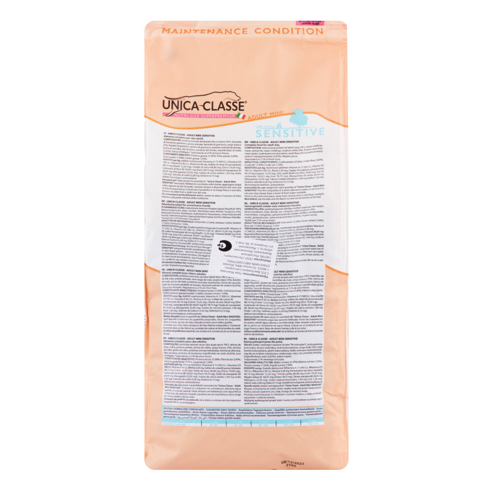 Unica Classe – корм уровня супер-премиум, основан на современном подходе к потребностям собак в зависимости от их размера, возраста, образа и условий жизни. В составе высокое содержание качественного животного белка, белое сорго – альтернативный злак с самым низким гликемическим индексом, а также порошок Кэроба, богатый натуральными пищевыми волокнами, важными для микрофлоры кишечника. Не содержит искусственных добавок, красителей и ароматизаторов.